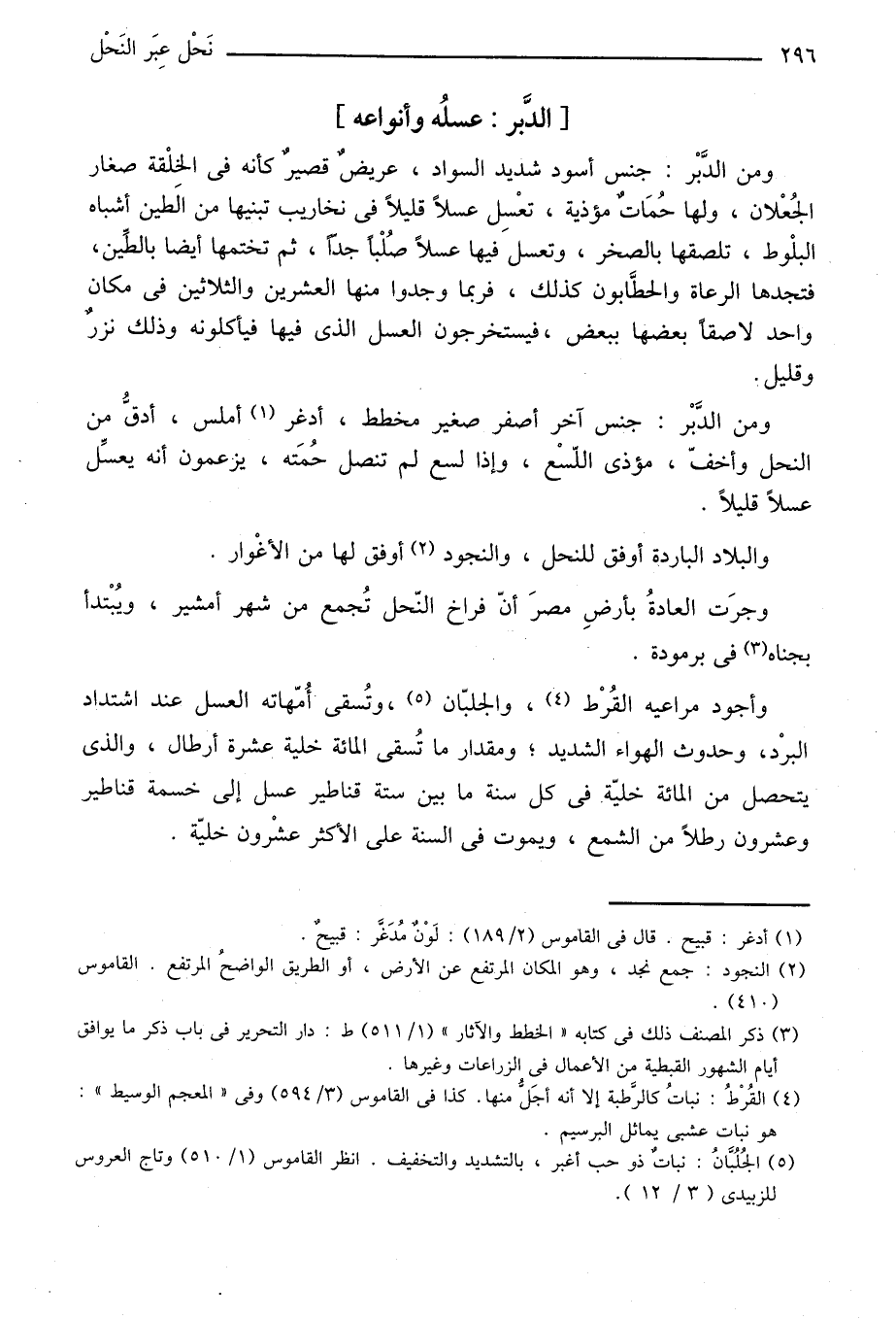 وأجود مراعيه القرط «4» ، والجلبّان «5» ، وتسقى أمّهاته العسل عند اشتداد البرد، وحدوث الهواء الشديد؛ ومقدار ما تسقى المائة خلية عشرة أرطال، والذى يتحصل من المائة خليّة في كل سنة ما بين ستة قناطير عسل إلى خمسة قناطير وعشرون رطلا من الشمع، ويموت في السنة على الأكثر عشرون خليّة.