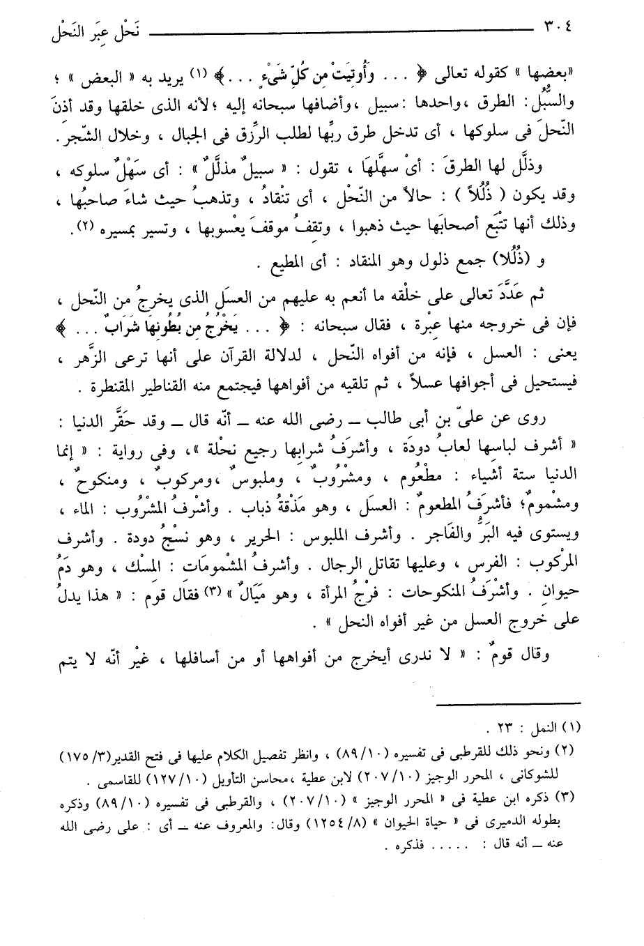 «أشرف لباسها لعاب دودة، وأشرف شرابها رجيع نحلة» ، وفي رواية: «إنما الدنيا ستة أشياء: مطعوم، ومشروب، وملبوس، ومركوب، ومنكوح، ومشموم؛ فأشرف المطعوم: العسل، وهو مذقة ذباب. وأشرف المشروب: الماء، ويستوى فيه البرّ والفاجر. وأشرف الملبوس: الحرير، وهو نسج دودة. وأشرف المركوب: الفرس، وعليها تقاتل الرجال. وأشرف المشمومات: المسك، وهو دم حيوان. وأشرف المنكوحات: فرج المرأة، وهو ميال» «3» فقال قوم: «هذا يدل على خروج العسل من غير أفواه النحل» .