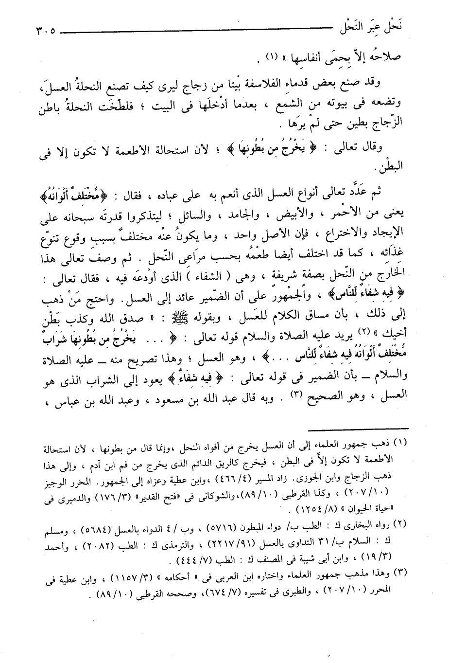 ، والجمهور على أن الضّمير عائد إلى العسل. واحتج من ذهب إلى ذلك، بأن مساق الكلام للعسل، وبقوله صلى الله عليه وسلّم: «صدق الله وكذب بطن أخيك» «2» يريد عليه الصلاة والسلام قوله تعالى: ... يَخْرُجُ مِنْ بُطُونِها شَرابٌ مُخْتَلِفٌ أَلْوانُهُ فِيهِ شِفاءٌ لِلنَّاسِ ...