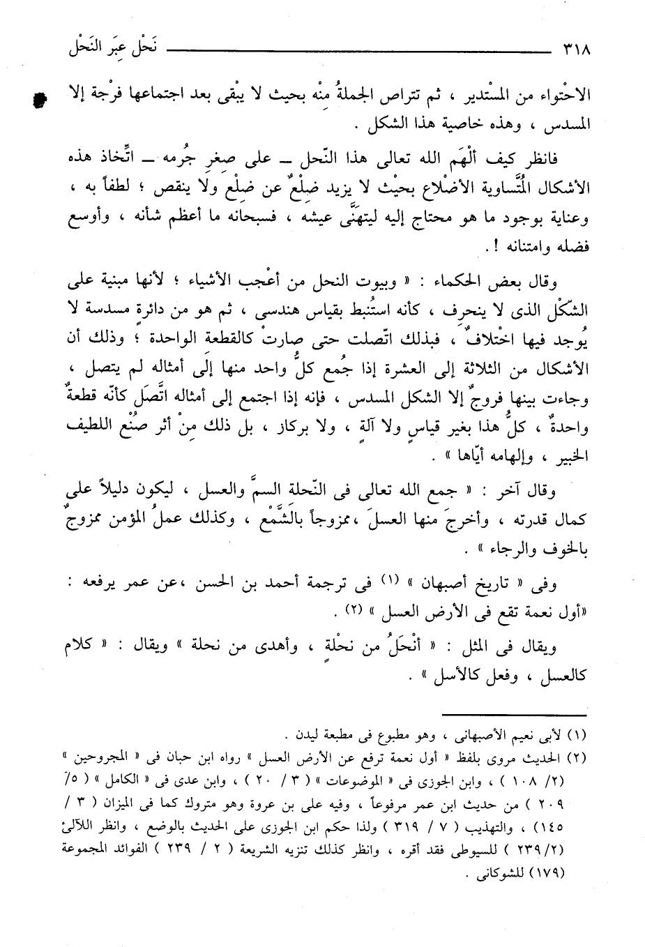 فانظر كيف ألهم الله تعالى هذا النّحل- على صغر جرمه- اتّخاذ هذه الأشكال المتّساوية الأضلاع بحيث لا يزيد ضلع عن ضلع ولا ينقص؛ لطفا به، وعناية بوجود ما هو محتاج إليه ليتهنّى عيشه، فسبحانه ما أعظم شأنه، وأوسع فضله وامتنانه!.