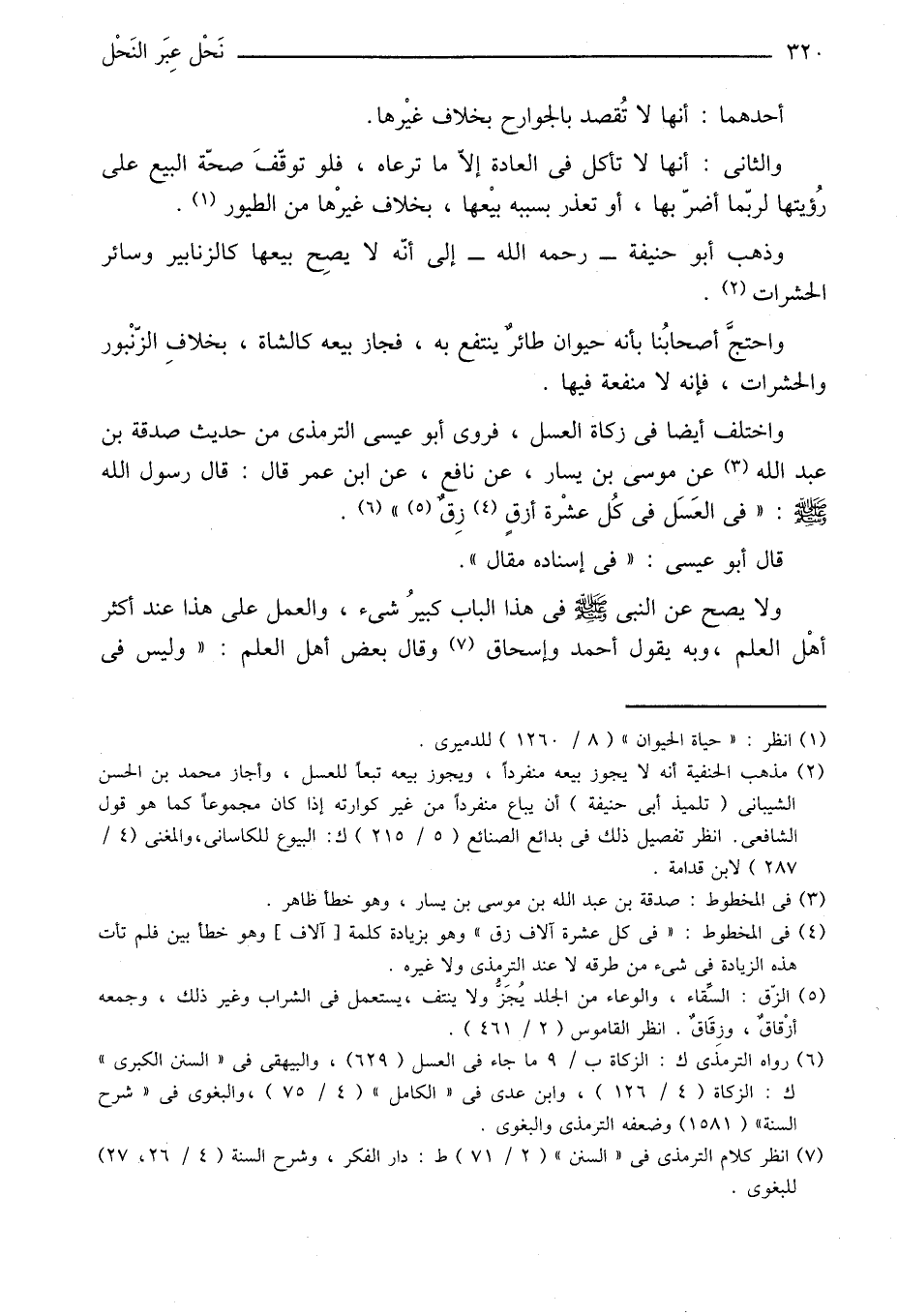 واختلف أيضا في زكاة العسل، فروى أبو عيسى الترمذى من حديث صدقة بن عبد الله «3» عن موسى بن يسار، عن نافع، عن ابن عمر قال: قال رسول الله صلى الله عليه وسلّم: «فى العسل في كل عشرة أزق «4» زق «5» » «6» .