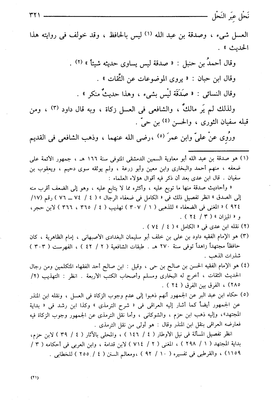 العسل شىء، وصدقة بن عبد الله «1» ليس بالحافظ، وقد خولف في روايته هذا الحديث» .