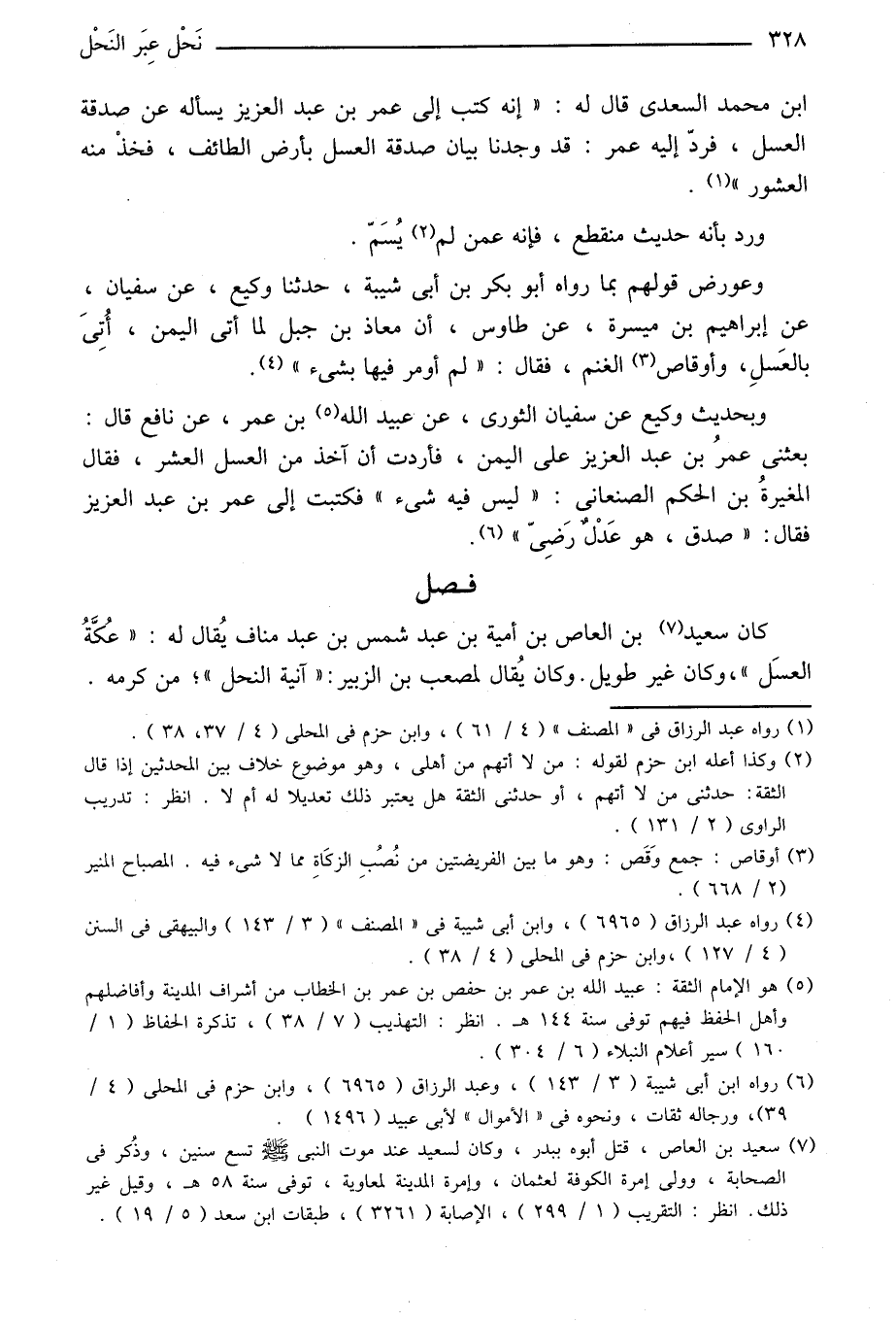 ابن محمد السعدى قال له: «إنه كتب إلى عمر بن عبد العزيز يسأله عن صدقة العسل، فردّ إليه عمر: قد وجدنا بيان صدقة العسل بأرض الطائف، فخذ منه العشور» «1» .
