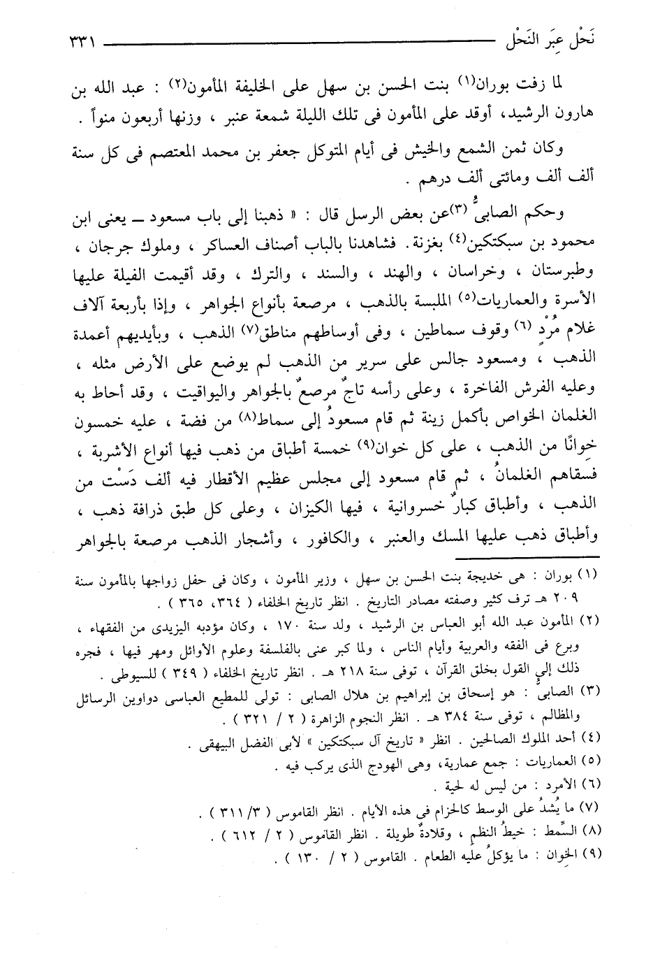 وحكم الصابىّ «3» عن بعض الرسل قال: «ذهبنا إلى باب مسعود- يعنى ابن محمود بن سبكتكين «4» بغزنة. فشاهدنا بالباب أصناف العساكر، وملوك جرجان، وطبرستان، وخراسان، والهند، والسند، والترك، وقد أقيمت الفيلة عليها الأسرة والعماريات «5» الملبسة بالذهب، مرصعة بأنواع الجواهر، وإذا بأربعة آلاف غلام مرد «6» وقوف سماطين، وفي أوساطهم مناطق «7» الذهب، وبأيديهم أعمدة الذهب، ومسعود جالس على سرير من الذهب لم يوضع على الأرض مثله، وعليه الفرش الفاخرة، وعلى رأسه تاج مرصع بالجواهر واليواقيت، وقد أحاط به الغلمان الخواص بأكمل زينة ثم قام مسعود إلى سماط «8» من فضة، عليه خمسون خوانا من الذهب، على كل خوان «9» خمسة أطباق من ذهب فيها أنواع الأشربة، فسقاهم الغلمان، ثم قام مسعود إلى مجلس عظيم الأقطار فيه ألف دست من الذهب، وأطباق كبار خسروانية، فيها الكيزان، وعلى كل طبق ذرافة ذهب، وأطباق ذهب عليها المسك والعنبر، والكافور، وأشجار الذهب مرصعة بالجواهر