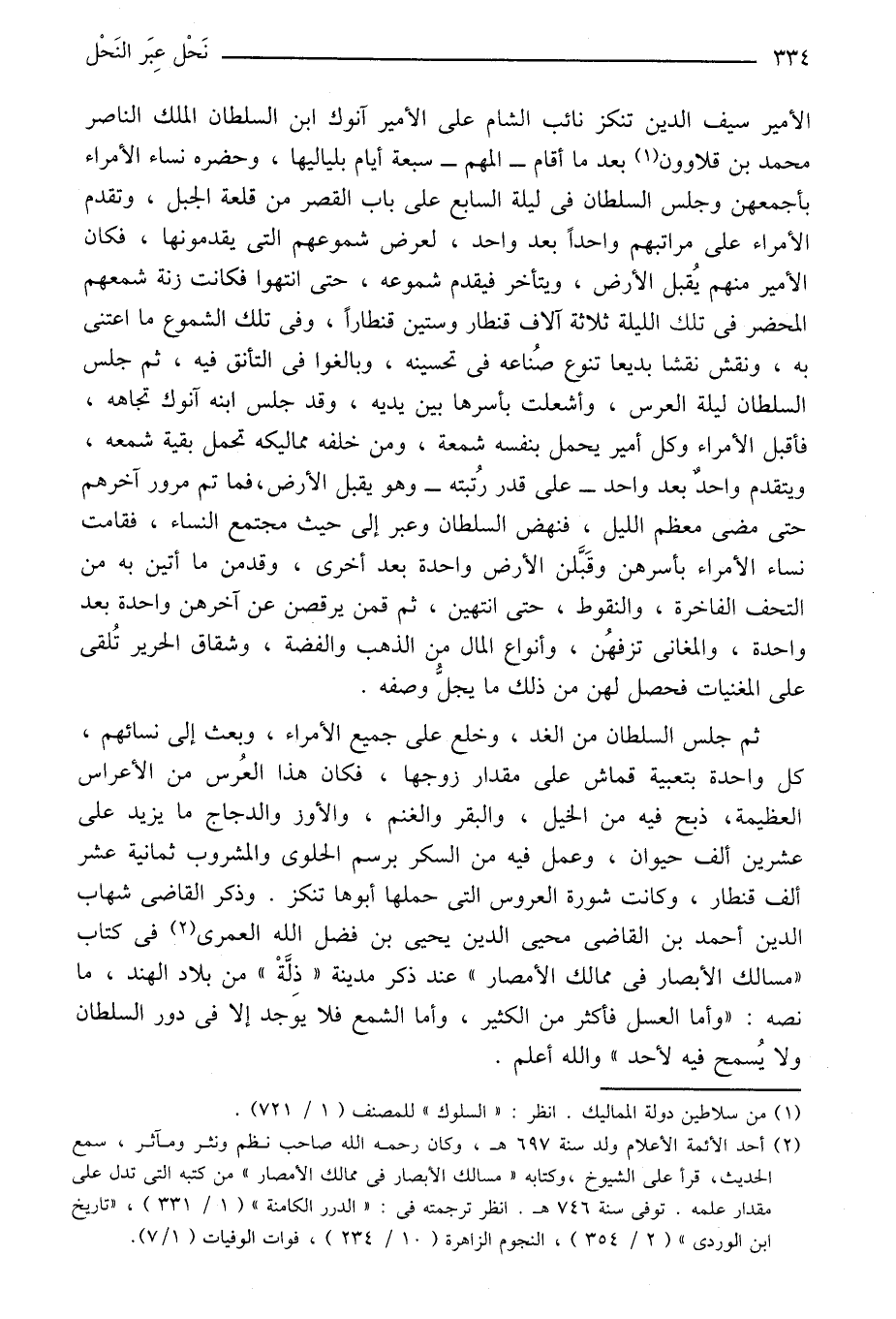 ثم جلس السلطان من الغد، وخلع على جميع الأمراء، وبعث إلى نسائهم، كل واحدة بتعبية قماش على مقدار زوجها، فكان هذا العرس من الأعراس العظيمة، ذبح فيه من الخيل، والبقر والغنم، والأوز والدجاج ما يزيد على عشرين ألف حيوان، وعمل فيه من السكر برسم الحلوى والمشروب ثمانية عشر ألف قنطار، وكانت شورة العروس التى حملها أبوها تنكز. وذكر القاضى شهاب الدين أحمد بن القاضى محيى الدين يحيى بن فضل الله العمرى «2» فى كتاب «مسالك الأبصار في ممالك الأمصار» عند ذكر مدينة «ذلّة» من بلاد الهند، ما نصه: «وأما العسل فأكثر من الكثير، وأما الشمع فلا يوجد إلا في دور السلطان ولا يسمح فيه لأحد» والله أعلم.