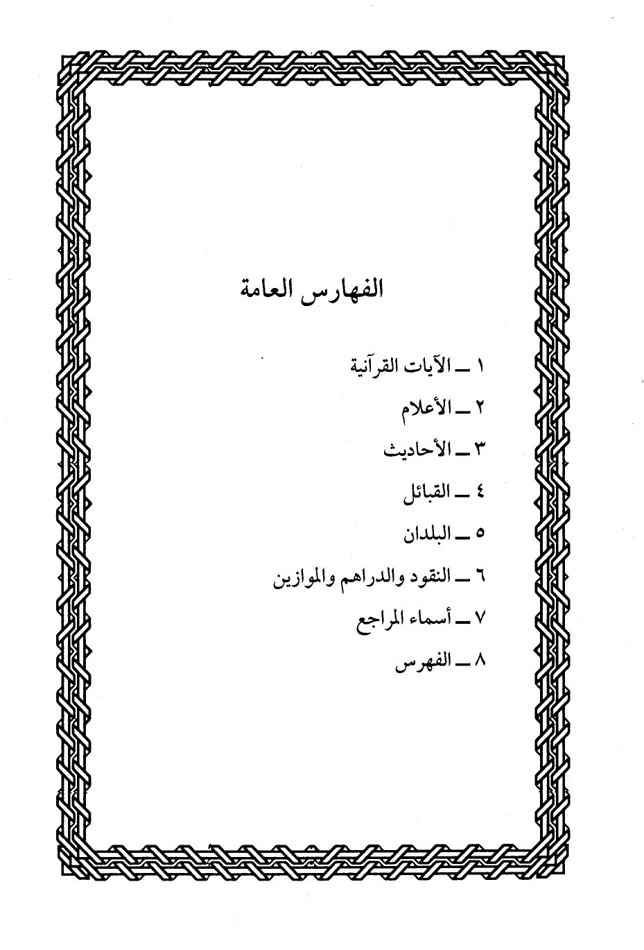 1- الآيات القرآنية 2- الأعلام 3- الأحاديث 4- القبائل 5- البلدان 6- النقود والدارهم والموازين 7- أسماء المراجع 8- الفهرس