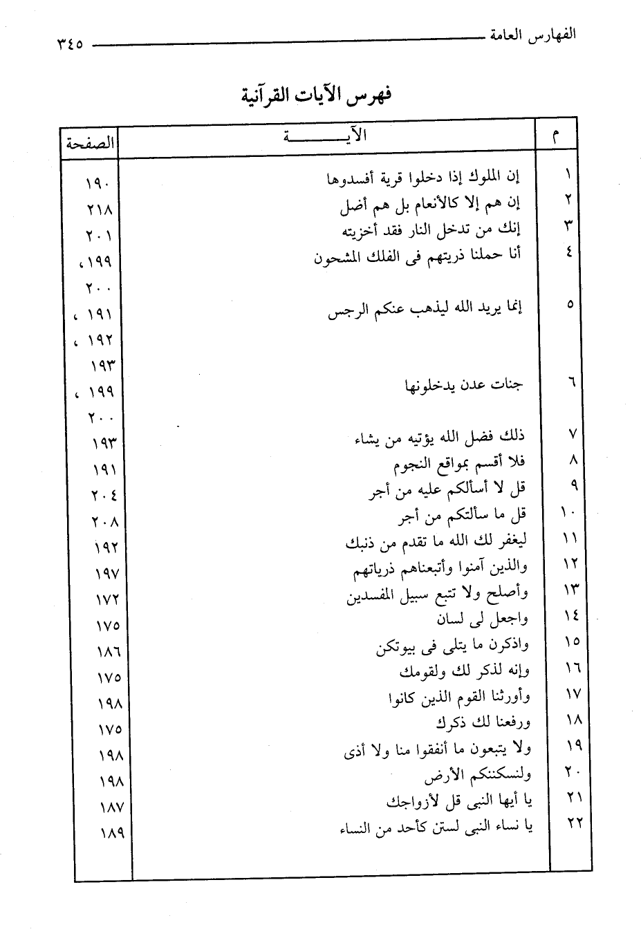 م: الآية: الصفحة 1: إن الملوك إذا دخلوا قرية أفسدوها: 190 2: إن هم إلا كالأنعام بل هم أضل: 218 3: إنك من تدخل النار فقد أخزيته: 201 4: أنا حملنا ذريتهم فى الفلك المشحون: 199، 200 5: إنما يريد الله ليذهب عنكم الرجس: 191، 192، 193 6: جنات عدن يدخلونها: 199، 200 7: ذلك فضل الله يؤتيه من يشاء: 193 8: فلا أقسم بمواقع النجوم: 191 9: قل لا أسألكم عليه من أجر: 204 10: قل ما سألتكم من أجر: 208 11: ليغفر لك الله ما تقدم من ذنبك: 192 12: والذين آمنوا وأتبعناهم ذرياتهم: 197 13: وأصلح ولا تتبع سبيل المفسدين: 172 14: واجعل لى لسان: 175 15: واذكرن ما يتلى فى بيوتكن: 186 16: وإنه لذكر لك ولقومك: 175 17: وأورثنا القوم الذين كانوا: 198 18: ورفعنا لك ذكرك: 175 19: ولا يتبعون ما أنفقوا منا ولا أذى: 198 20: ولنسكننكم الأرض: 198 21: يا أيها النبى قل لأزواجك: 187 22: يا نساء النبى لستن كأحد من النساء: 189