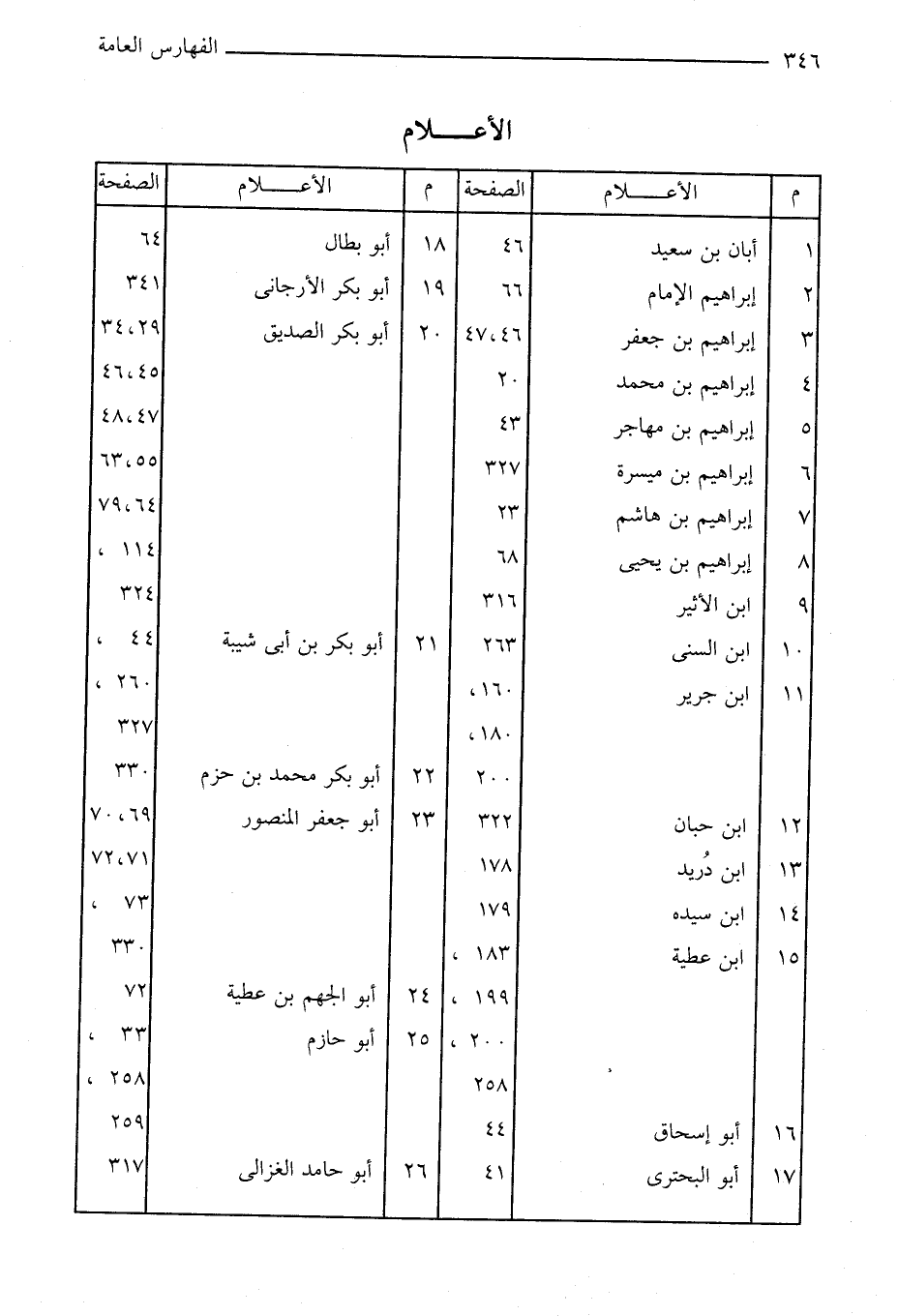: الصفحة: م: الأعلام: الصفحة: أبان بن سعيد: 46 2: إبراهيم الإمام: 66 3: إبراهيم بن جعفر: 46، 47 4: إبراهيم بن محمد: 20 5: إبراهيم بن مهاجر: 43 6: إبراهيم بن ميسرة: 327 7: إبراهيم بن هاشم: 23 8: إبراهيم بن يحيى: 68 9: ابن الأثير: 316 10: ابن السنى: 263 11: ابن جرير: 160، 180، 200، 12: ابن حبان: 322 13: ابن دريد: 178 14: ابن سيده: 179 15: ابن عطية: 183، 199، 200، 258 16: أبو إسحاق: 44 17: أبو البحترى: 41 18: أبو بطال: 64 19: أبو بكر الأرجانى: 341 20: أبو بكر الصديق: 29، 34 45، 46 47، 48 55، 63 64، 79 114، 324 21: أبو بكر بن أبي شيبة: 44، 260، 327 22: أبو بكر محمد بن حزم: 330 23: أبو جعفر المنصور: 69، 70 71، 72 73، 330 24: أبو الجهم بن عطية: 72 25: أبو حازم: 33، 258، 259 26: أبو حامد الغزالى: 317