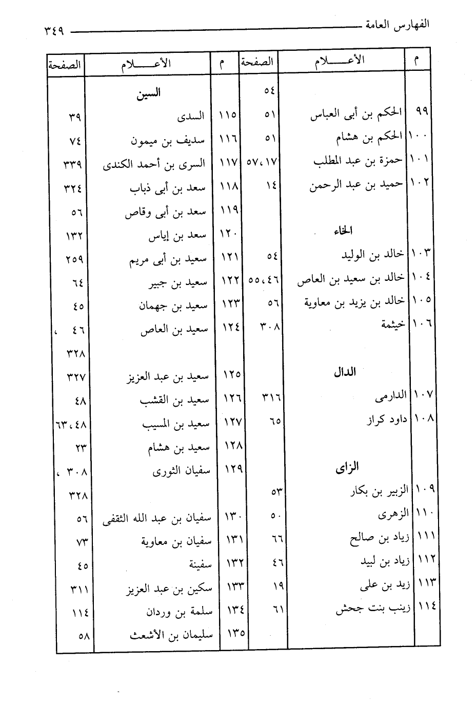 54 99: الحكم بن أبى العباس: 51 100: الحكم بن هشام: 51 101: حمزة بن عبد المطلب: 17، 57 102: حميد بن عبد الرحمن: 14 الخاء 103: خالد بن الوليد: 54 104: خالد بن سعيد بن العاص: 46، 55 105: خالد بن يزيد بن معاوية: 56 106: خيثمة: 308 الدال 107: الدارمى: 316 108: داود كراز: 65 الزاى 109: الزبير بن بكار: 53 110: الزهرى: 50 111: زياد بن صالح: 66 112: زياد بن لبيد: 46 113: زيد بن على: 19 114: زينب بنت جحش: 61 السين 115: السدى: 39 116: سديف بن ميمون: 74 117: السرى بن أحمد الكندى: 339 118: سعد بن أبى ذباب: 324 119: سعد بن أبى وقاص: 56 120: سعد بن إياس: 132 121: سعيد بن أبى مريم: 259 122: سعيد بن جبير: 64 123: سعيد بن جهمان: 45 124: سعيد بن العاص: 46، 328 125: سعيد بن عبد العزيز: 327 126: سعيد بن القشب: 48 127: سعيد بن المسيب: 48، 63 128: سعيد بن هشام: 23 129: سفيان الثورى: 308، 328 130: سفيان بن عبد الله الثقفى: 56 131: سفيان بن معاوية: 73 132: سفينة: 45 133: سكين بن عبد العزيز: 311 134: سلمة بن وردان: 114 135: سليمان بن الأشعث: 58