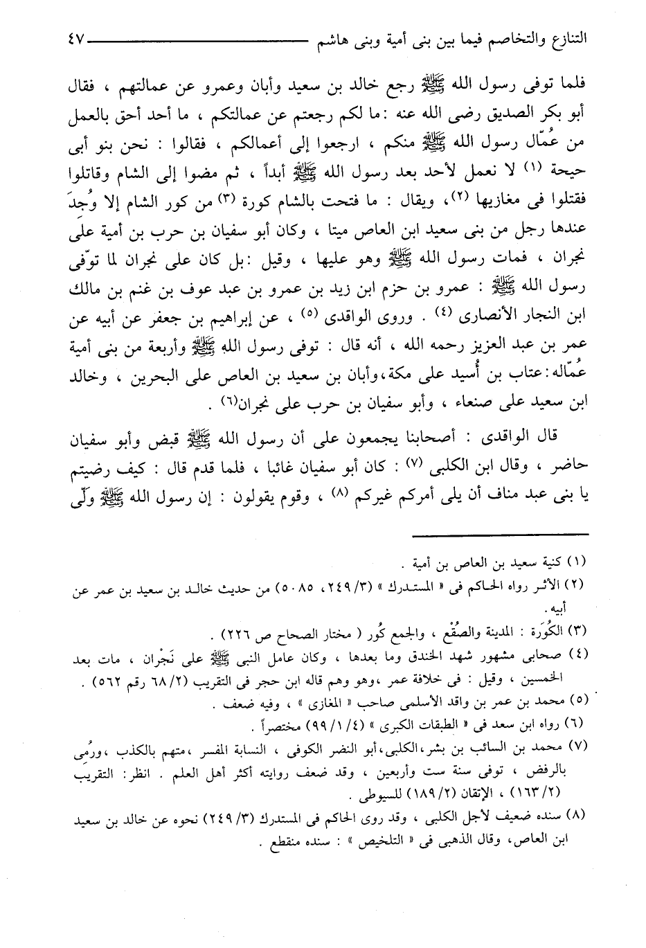 فلما توفى رسول الله صلى الله عليه وسلّم رجع خالد بن سعيد وأبان وعمرو عن عمالتهم، فقال أبو بكر الصديق رضى الله عنه: ما لكم رجعتم عن عمالتكم، ما أحد أحق بالعمل من عمّال رسول الله صلى الله عليه وسلّم منكم، ارجعوا إلى أعمالكم، فقالوا: نحن بنو أبى حيحة «1» لا نعمل لأحد بعد رسول الله صلى الله عليه وسلّم أبدا، ثم مضوا إلى الشام وقاتلوا فقتلوا في مغازيها «2» ، ويقال: ما فتحت بالشام كورة «3» من كور الشام إلا وجد عندها رجل من بنى سعيد ابن العاص ميتا، وكان أبو سفيان بن حرب بن أمية على نجران، فمات رسول الله صلى الله عليه وسلّم وهو عليها، وقيل: بل كان على نجران لما توّفى رسول الله صلى الله عليه وسلّم: عمرو بن حزم ابن زيد بن عمرو بن عبد عوف بن غنم بن مالك ابن النجار الأنصارى «4» . وروى الواقدى «5» ، عن إبراهيم بن جعفر عن أبيه عن عمر بن عبد العزيز رحمه الله، أنه قال: توفى رسول الله صلى الله عليه وسلّم وأربعة من بنى أمية عمّاله: عتاب بن أسيد على مكة، وأبان بن سعيد بن العاص على البحرين، وخالد ابن سعيد على صنعاء، وأبو سفيان بن حرب على نجران «6» .