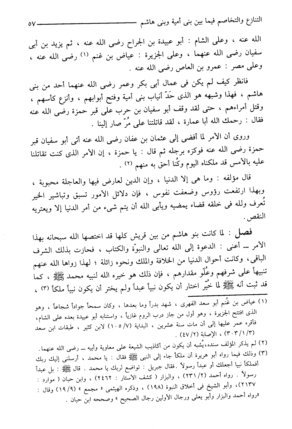 (فصل:) لما كانت بنو هاشم من بين قريش كلها قد اختصها الله سبحانه بهذا الأمر- أعنى: الدعوة إلى الله تعالى والنبوّة والكتاب، فحازت بذلك الشرف الباقى، وكانت أحوال الدنيا من الخلافة والملك ونحوه زائلة؛ لهذا زواها الله عنهم تنبيها على شرفهم وعلّو مقدارهم، فإن ذلك هو خيره الله لنبيه محمد صلى الله عليه وسلّم، كما قد ثبت أنه صلى الله عليه وسلّم لما خيّر اختار أن يكون نبيا عبدا ولم يختر أن يكون نبيا ملكا «3» ،