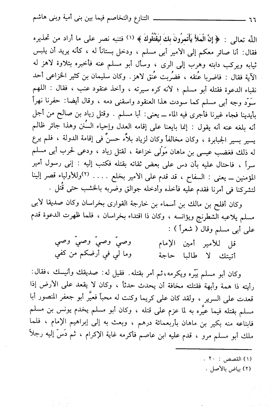 «1» فتنبه نصر على ما أراد من تحذيره فقال: أنا صائر معكم إلى الأمير أبى مسلم، ودخل بستانا له، كأنه يريد أن يلبس ثيابه ويركب دابته وهرب إلى الرى، وسأل أبو مسلم عنه فأخبره بتلاوة لاهز له الآية فقال: فاضربا عنقه، فضربت عنق لاهز. وكان سليمان بن كثير الخزاعى أحد نقباء الدعوة فقتله أبو مسلم؛ لأنه كره سيرته، وأخذ عنقود عنب، فقال: اللهم سوّد وجه أبى مسلم كما سودت هذا العنقود واسقنى دمه، وقال أيضا: حفرنا نهرا بأيدينا فجاء غيرنا فأجرى فيه الماء- يعنى: أبا مسلم. وقتل زياد بن صالح من أجل أنه بلغه عنه أنه يقول: إنما بايعنا على إقامه العدل وإحياء السنن وهذا جائر ظالم يسير بسير الجبابرة، وكان مخالفا وكان لزياد بلاء حسن في إقامة الدولة، فلم يرع له ذلك فغضب عيسى بن ماهان مولى خزاعة، لقتل زياد، ودعى لحرب أبى مسلم سرا، فاحتال عليه بأن دس على بعض ثقاته بقتله فكتب إليه: إنى رسول أمير المؤمنين- يعنى: السفاح، قد قدم على الأمير بخلع.... «2» وللأولياء قصر إلينا لتشركنا في أمرنا فقدم عليه فأخذه وأدخله جوالق وضربه بالخشب حتى قتل.