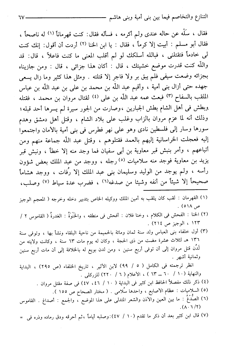 فقال، سله عن حاله عندى ولم أكرمه، فسأله فقال: كنت قهرمانا «1» له ناصحا، فقال أبو مسلم: أبيت إلا كرما، فقال: يا ابن الخنا «2» أردت أن أقول: إنك كنت لى خادما فتقتلنى، فبالله أسلكك لو لم أقلب المعنى ما كنت فاعلا، قال: قد والله كنت قدرت موضع خشيتك، قال: أكان هذا جزائى، قال: ومن جازيناه بجزائه وضعت سيفى فلم يبق بر ولا فاجر إلا قتلته. ومثل هذا كثير وما زال يسعى جهده حتى أزال بنى أمية، وأقيم عبد الله بن محمد بن على بن عبد الله بن عباس الملقب بالسفاح «3» فبعث عمه عبد الله بن على «4» لقتال مروان بن محمد، فقتله وبطش في أهل الشام بطش الجبارين، وصارت من الجور سيرة لم يسرها أحد قبله؛ وذلك أنه لما عزم مروان بالزاب وغلب على بلاد الشام، وقتل أهل دمشق وهدم سورها وسار إلى فلسطين نادى وهو على نهر فطرس في بنى أمية بالأمان واجتمعوا إليه فعجلت الخراسانية إليهم بالعمد فقتلوهم، وقتل عبد الله جماعة منهم ومن أتباعهم، وأمر بنبش قبر معاوية بن أبى سفيان فما وجد منه إلا خطا، ونبش قبر يزيد بن معاوية فوجد منه سلاميات «5» رجله، ووجد من عبد الملك بعض شؤون رأسه، ولم يوجد من الوليد وسليمان بنى عبد الملك إلا رفات، ووجد هشاما صحيحا إلا شيئا من أنفه وشيئا من صدغه «6» ، فضرب عدة سياط «7» وصلب،