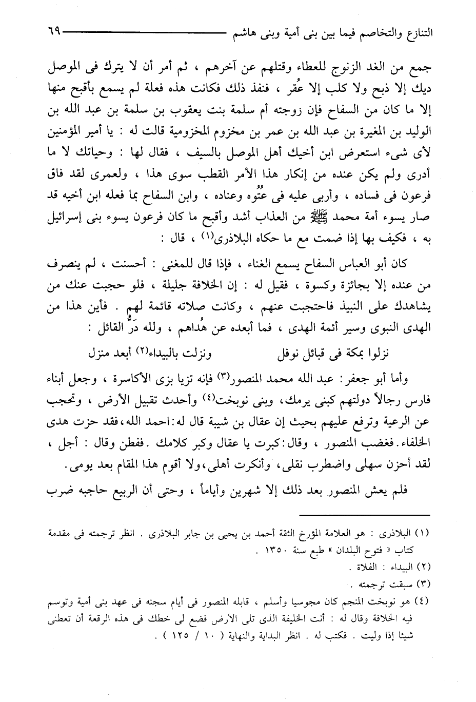 جمع من الغد الزنوج للعطاء وقتلهم عن آخرهم، ثم أمر أن لا يترك في الموصل ديك إلا ذبح ولا كلب إلا عقر، فنفذ ذلك فكانت هذه فعلة لم يسمع بأقبح منها إلا ما كان من السفاح فإن زوجته أم سلمة بنت يعقوب بن سلمة بن عبد الله بن الوليد بن المغيرة بن عبد الله بن عمر بن مخزوم المخزومية قالت له: يا أمير المؤمنين لأى شىء استعرض ابن أخيك أهل الموصل بالسيف، فقال لها: وحياتك لا ما أدرى ولم يكن عنده من إنكار هذا الأمر القطب سوى هذا، ولعمرى لقد فاق فرعون في فساده، وأربى عليه في عتوه وعناده، وابن السفاح بما فعله ابن أخيه قد صار يسوء أمة محمد صلى الله عليه وسلّم من العذاب أشد وأقبح ما كان فرعون يسوء بنى إسرائيل به، فكيف بها إذا ضمت مع ما حكاه البلاذرى «1» ، قال: