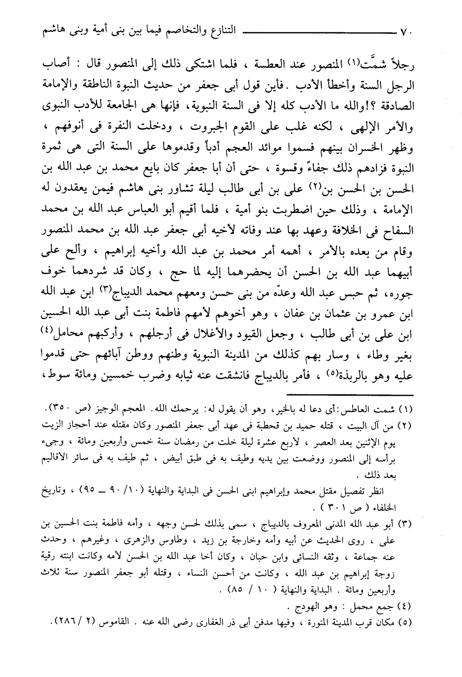 رجلا شمّت «1» المنصور عند العطسة، فلما اشتكى ذلك إلى المنصور قال: أصاب الرجل السنة وأخطأ الأدب. فأين قول أبى جعفر من حديث النبوة الناطقة والإمامة الصادقة؟! والله ما الأدب كله إلا في السنة النبوية، فإنها هى الجامعة للأدب النبوى والأمر الإلهى، لكنه غلب على القوم الجبروت، ودخلت النفرة في أنوفهم، وظهر الخسران بينهم فسموا موائد العجم أدبا وقدموها على السنة التى هى ثمرة النبوة فزادهم ذلك جفاء وقسوة، حتى أن أبا جعفر كان بايع محمد بن عبد الله بن الحسن بن الحسن بن «2» على بن أبى طالب ليلة تشاور بنى هاشم فيمن يعقدون له الإمامة، وذلك حين اضطربت بنو أمية، فلما أقيم أبو العباس عبد الله بن محمد السفاح في الخلافة وعهد بها عند وفاته لأخيه أبى جعفر عبد الله بن محمد المنصور وقام من بعده بالأمر، أهمه أمر محمد بن عبد الله وأخيه إبراهيم، وألح على أبيهما عبد الله بن الحسن أن يحضرهما إليه لما حج، وكان قد شردهما خوف جوره، ثم حبس عبد الله وعدّه من بنى حسن ومعهم محمد الديباج «3» ابن عبد الله ابن عمرو بن عثمان بن عفان، وهو أخوهم لأمهم فاطمة بنت أبى عبد الله الحسين ابن على بن أبى طالب، وجعل القيود والأغلال في أرجلهم، وأركبهم محامل «4» بغير وطاء، وسار بهم كذلك من المدينة النبوية وطنهم ووطن آبائهم حتى قدموا عليه وهو بالربذة «5» ، فأمر بالديباج فانشقت عنه ثيابه وضرب خمسين ومائة سوط،
