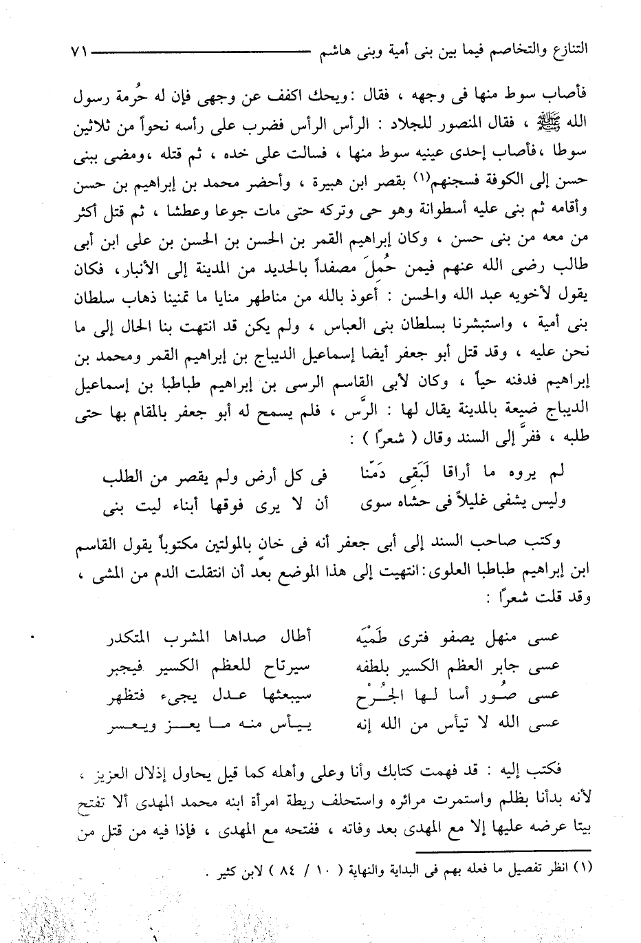 وكتب صاحب السند إلى أبى جعفر أنه في خان بالمولتين مكتوبا يقول القاسم ابن إبراهيم طباطبا العلوى: انتهيت إلى هذا الموضع بعد أن انتقلت الدم من المشى، وقد قلت شعرا: