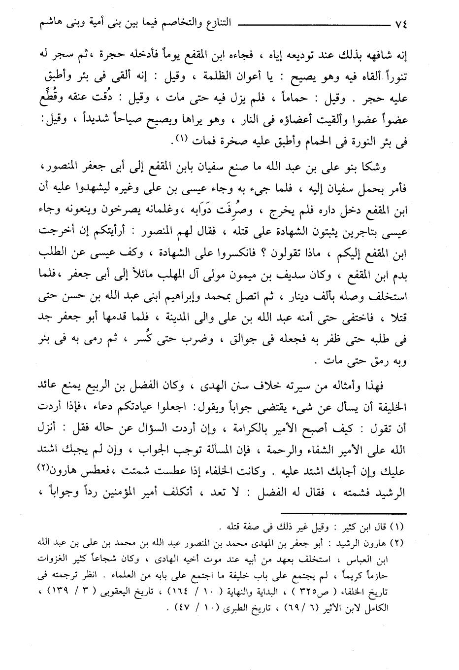 وشكا بنو على بن عبد الله ما صنع سفيان بابن المقفع إلى أبى جعفر المنصور، فأمر بحمل سفيان إليه، فلما جىء به وجاء عيسى بن على وغيره ليشهدوا عليه أن ابن المقفع دخل داره فلم يخرج، وصرفت دوابه، وغلمانه يصرخون وينعونه وجاء عيسى بتاجرين يثبتون الشهادة على قتله، فقال لهم المنصور: أرأيتكم إن أخرجت ابن المقفع إليكم، ماذا تقولون؟ فانكسروا على الشهادة، وكف عيسى عن الطلب بدم ابن المقفع، وكان سديف بن ميمون مولى آل المهلب مائلا إلى أبى جعفر، فلما استخلف وصله بألف دينار، ثم اتصل بمحمد وإبراهيم ابنى عبد الله بن حسن حتى قتلا، فاختفى حتى أمنه عبد الله بن على والى المدينة، فلما قدمها أبو جعفر جد فى طلبه حتى ظفر به فجعله في جوالق، وضرب حتى كسر، ثم رمى به في بئر وبه رمق حتى مات.