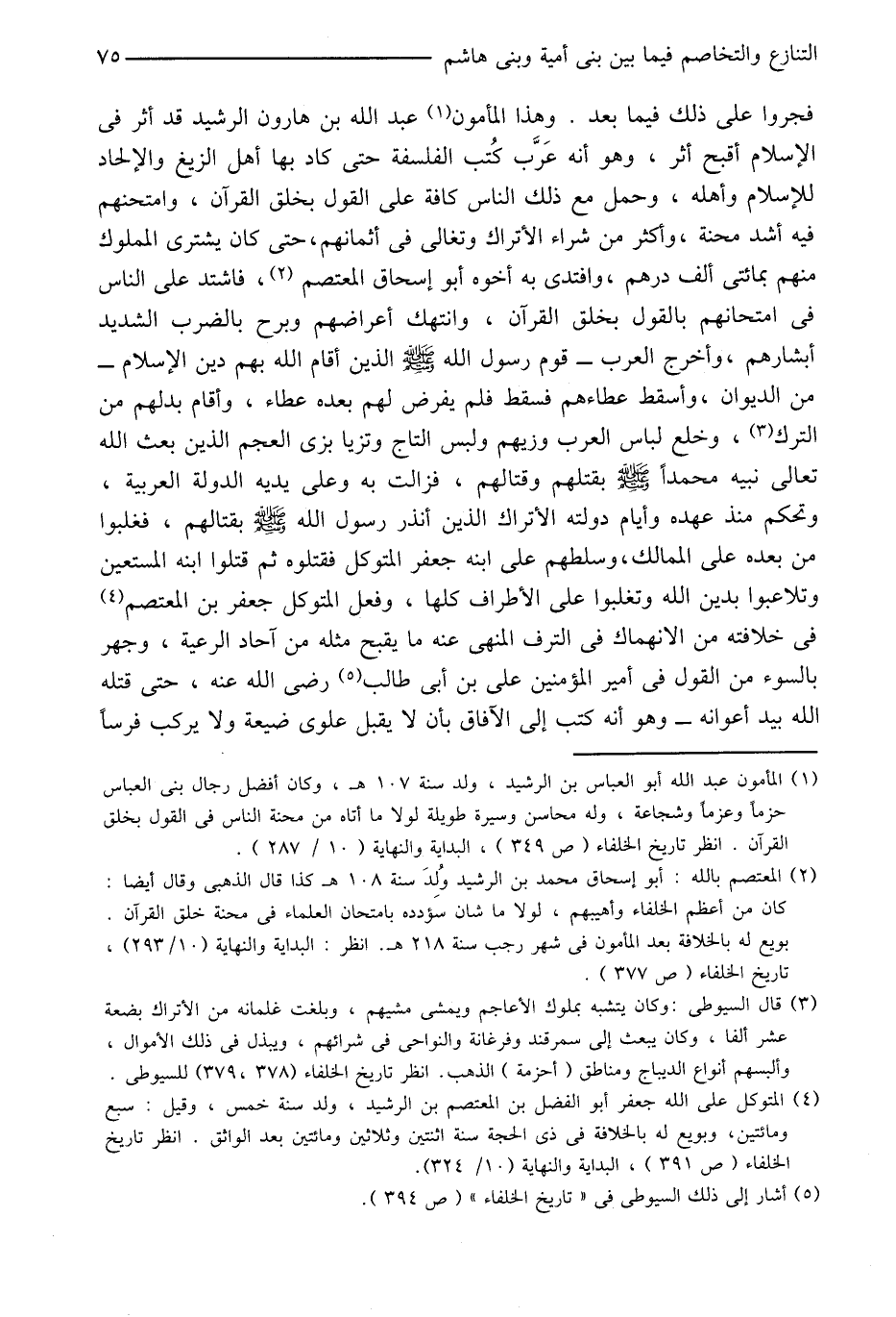 فجروا على ذلك فيما بعد. وهذا المأمون «1» عبد الله بن هارون الرشيد قد أثر في الإسلام أقبح أثر، وهو أنه عرّب كتب الفلسفة حتى كاد بها أهل الزيغ والإلحاد للإسلام وأهله، وحمل مع ذلك الناس كافة على القول بخلق القرآن، وامتحنهم فيه أشد محنة، وأكثر من شراء الأتراك وتغالى في أثمانهم، حتى كان يشترى المملوك منهم بمائتى ألف درهم، وافتدى به أخوه أبو إسحاق المعتصم «2» ، فاشتد على الناس فى امتحانهم بالقول بخلق القرآن، وانتهك أعراضهم وبرح بالضرب الشديد أبشارهم، وأخرج العرب- قوم رسول الله صلى الله عليه وسلّم الذين أقام الله بهم دين الإسلام- من الديوان، وأسقط عطاءهم فسقط فلم يفرض لهم بعده عطاء، وأقام بدلهم من الترك «3» ، وخلع لباس العرب وزيهم ولبس التاج وتزيا بزى العجم الذين بعث الله تعالى نبيه محمدا صلى الله عليه وسلّم بقتلهم وقتالهم، فزالت به وعلى يديه الدولة العربية، وتحكم منذ عهده وأيام دولته الأتراك الذين أنذر رسول الله صلى الله عليه وسلّم بقتالهم، فغلبوا من بعده على الممالك، وسلطهم على ابنه جعفر المتوكل فقتلوه ثم قتلوا ابنه المستعين وتلاعبوا بدين الله وتغلبوا على الأطراف كلها، وفعل المتوكل جعفر بن المعتصم «4» فى خلافته من الانهماك في الترف المنهى عنه ما يقبح مثله من آحاد الرعية، وجهر بالسوء من القول في أمير المؤمنين على بن أبى طالب «5» رضى الله عنه، حتى قتله الله بيد أعوانه- وهو أنه كتب إلى الآفاق بأن لا يقبل علوى ضيعة ولا يركب فرسا