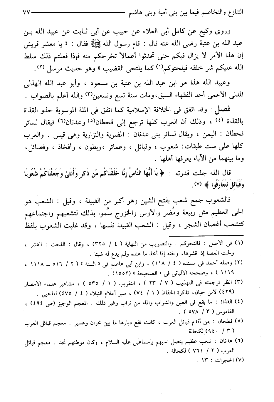 (فصل:) وقد اتفق في الخلافة الإسلامية كما اتفق في الملة الموسوية حذو القذاة بالقذاة «4» ، وذلك أن العرب كلها ترجع إلى قحطان «5» وعدنان «6» فيقال لسائر قحطان: اليمن، ويقال لسائر بنى عدنان: المضرية والنزارية وهى قيس. والعرب كلها على ست طبقات: شعوب، وقبائل، وعمائر، وبطون، وأفخاذ، وفصائل، وما بينهما من الآباء يعرفها أهلها.