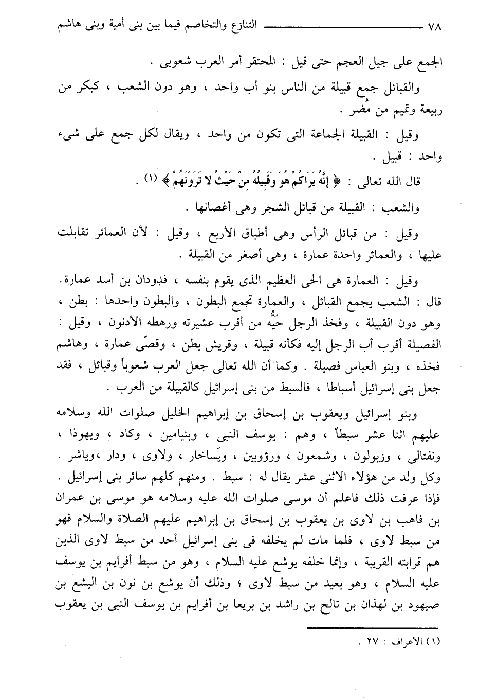 قال: الشعب يجمع القبائل، والعمارة تجمع البطون، والبطون واحدها: بطن، وهو دون القبيلة، وفخذ الرجل حيّه من أقرب عشيرته ورهطه الأدنون، وقيل: