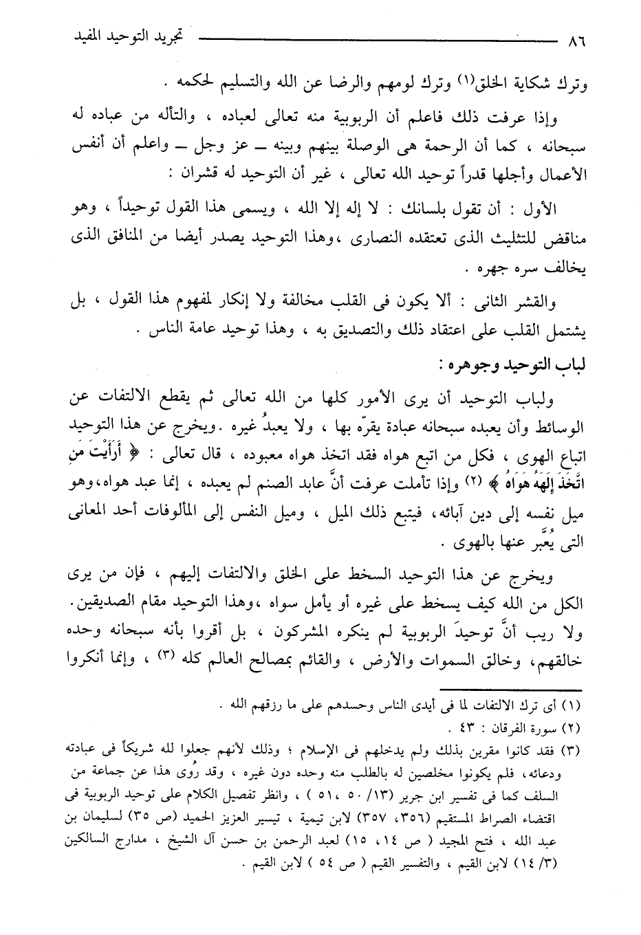 وإذا عرفت ذلك فاعلم أن الربوبية منه تعالى لعباده، والتأله من عباده له سبحانه، كما أن الرحمة هى الوصلة بينهم وبينه- عز وجل- واعلم أن أنفس الأعمال وأجلها قدرا توحيد الله تعالى، غير أن التوحيد له قشران: