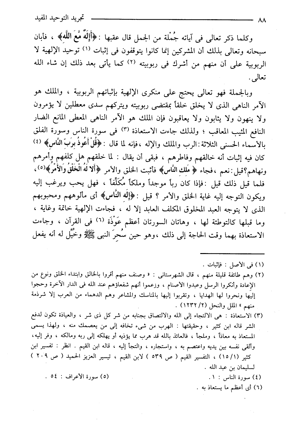وبالجملة فهو تعالى يحتج على منكرى الإلهية بإثباتهم الربوبية، والملك هو الآمر الناهى الذى لا يخلق خلقا بمقتضى ربوبيته ويتركهم سدى معطلين لا يؤمرون ولا ينهون ولا يثابون ولا يعاقبون فإن الملك هو الآمر الناهى المعطى المانع الضار النافع المثيب المعاقب؛ ولذلك جاءت الاستعاذة «3» فى سورة الناس وسورة الفلق بالأسماء الحسنى الثلاثة: الرب والملك والإله، فإنه لما قال: قُلْ أَعُوذُ بِرَبِّ النَّاسِ