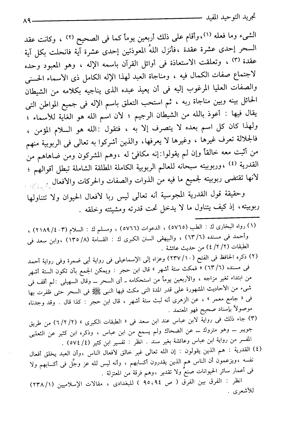 الشىء وما فعله «1» ، وأقام على ذلك أربعين يوما كما في الصحيح «2» ، وكانت عقد السحر إحدى عشرة عقدة، فأنزل الله المعوذتين إحدى عشرة آية فانحلت بكل آية عقدة «3» ، وتعلقت الاستعاذة في أوائل القرآن باسمه الإله، وهو المعبود وحده لاجتماع صفات الكمال فيه، ومناجاة العبد لهذا الإله الكامل ذى الأسماء الحسنى والصفات العليا المرغوب إليه في أن يعيذ عبده الذى يناجيه بكلامه من الشيطان الحائل بينه وبين مناجاة ربه، ثم استحب التعلق باسم الإله في جميع المواطن التى يقال فيها: أعوذ بالله من الشيطان الرجيم؛ لأن اسم الله هو الغاية للأسماء؛ ولهذا كان كل اسم بعده لا يتصرف إلا به، فتقول: الله هو السلام المؤمن، فالجلالة تعرف غيرها، وغيرها لا يعرفها، والذين أشركوا به تعالى في الربوبية منهم من أثبت معه خالقا وإن لم يقولوا: إنه مكافئ له، وهم المشركون ومن ضاهاهم من القدرية «4» ، وربوبيته سبحانه للعالم الربوبية الكاملة المطلقة الشاملة تبطل أقوالهم؛ لأنها تقتضى ربوبيته لجميع ما فيه من الذوات والصفات والحركات والأفعال.