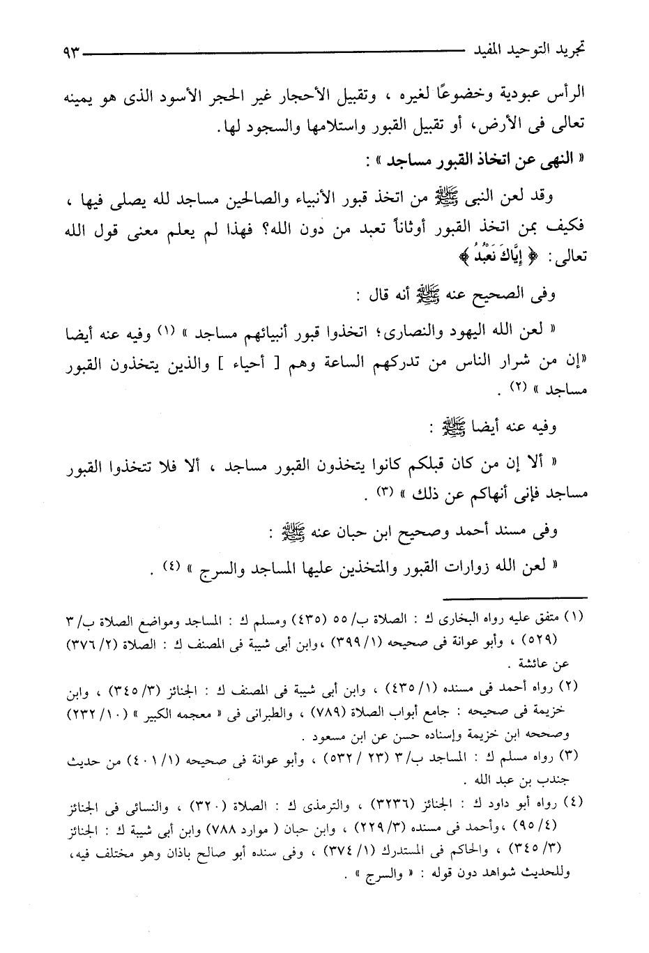 «لعن الله اليهود والنصارى؛ اتخذوا قبور أنبيائهم مساجد» «1» وفيه عنه أيضا «إن من شرار الناس من تدركهم الساعة وهم [أحياء] والذين يتخذون القبور مساجد» «2» .