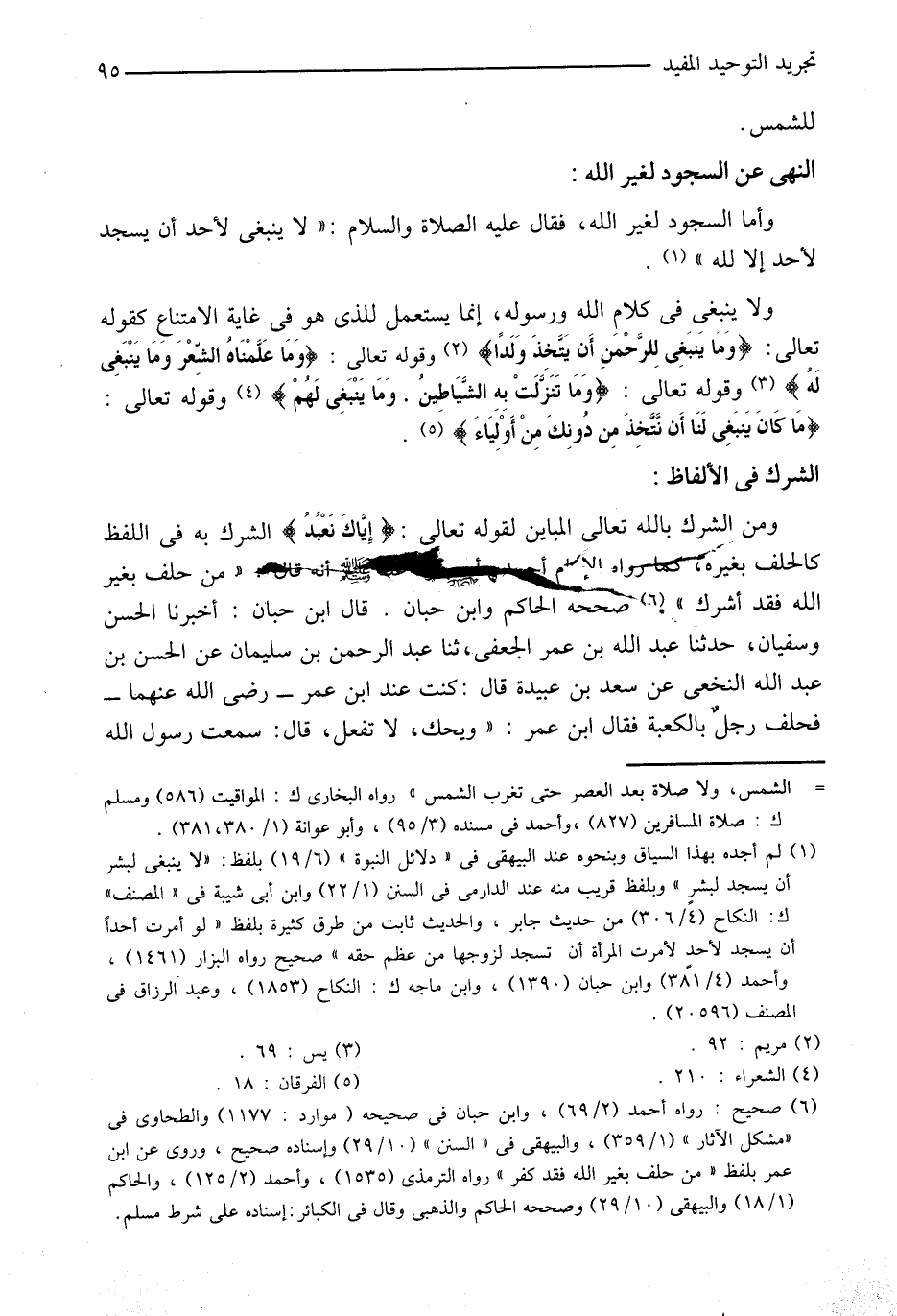 الشرك به في اللفظ كالحلف بغيره، كما رواه الإمام أحمد وأبو داود عنه صلى الله عليه وسلّم أنه قال: «من حلف بغير الله فقد أشرك» «6» صححه الحاكم وابن حبان. قال ابن حبان: أخبرنا الحسن وسفيان، حدثنا عبد الله بن عمر الجعفى، ثنا عبد الرحمن بن سليمان عن الحسن بن عبد الله النخعى عن سعد بن عبيدة قال: كنت عند ابن عمر- رضى الله عنهما- فحلف رجل بالكعبة فقال ابن عمر: «ويحك، لا تفعل، قال: سمعت رسول الله