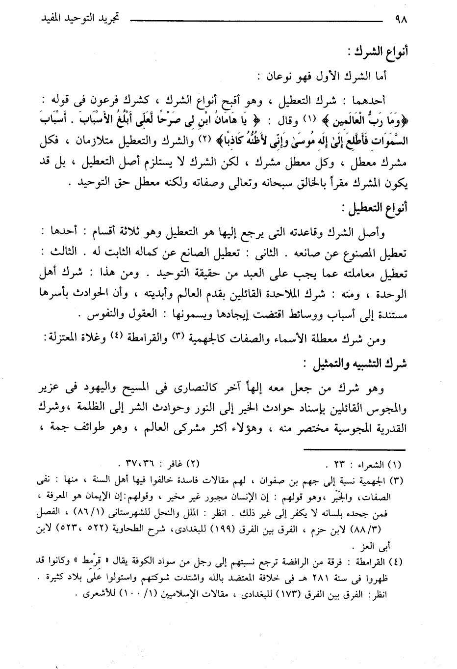 «2» والشرك والتعطيل متلازمان، فكل مشرك معطل، وكل معطل مشرك، لكن الشرك لا يستلزم أصل التعطيل، بل قد يكون المشرك مقرا بالخالق سبحانه وتعالى وصفاته ولكنه معطل حق التوحيد.