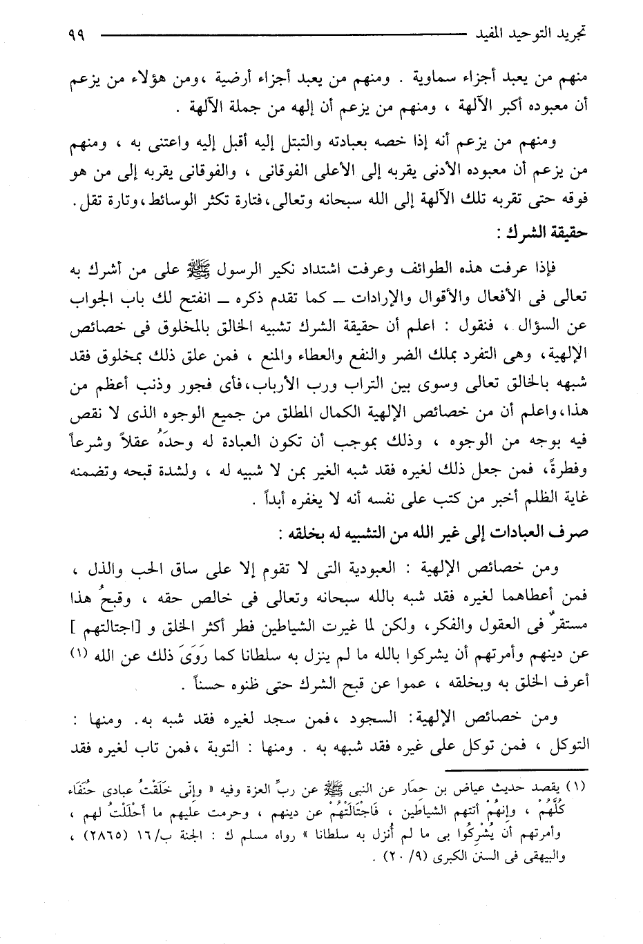 ومن خصائص الإلهية: العبودية التى لا تقوم إلا على ساق الحب والذل، فمن أعطاهما لغيره فقد شبه بالله سبحانه وتعالى في خالص حقه، وقبح هذا مستقر في العقول والفكر، ولكن لما غيرت الشياطين فطر أكثر الخلق و [اجتالتهم] عن دينهم وأمرتهم أن يشركوا بالله ما لم ينزل به سلطانا كما روى ذلك عن الله «1» أعرف الخلق به وبخلقه، عموا عن قبح الشرك حتى ظنوه حسنا.