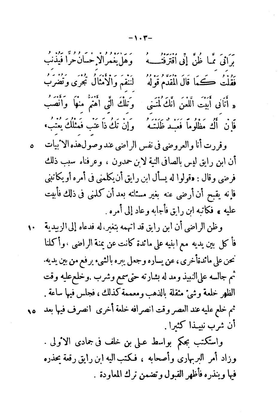 وقررت أنا والعروضي في نفس الراضي عند وصول هذه الأبيات أن ابن رايق ليس بالصافي النية لابن حمدون، وعرفنا سبب ذلك فرضي وقال: قولوا له يسأل ابن رايق أن يكلمني في أمره أو يكاتبني فإنه يقبح أن أرضى عنه بغير مسئلته بعد أن كلمني في ذلك فأبيت عليه فكاتبه ابن رايق فأجابه وعاد إلى أمره.