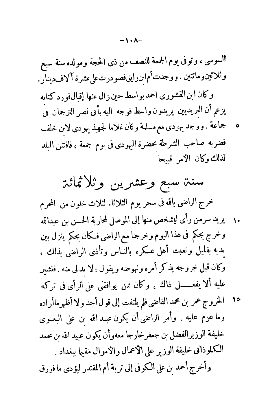 وكان ابن القشوري أحمد بواسط حين زال عنها إقبال فورد كتابه يزعم أن البريديين يريدون واسط فوجه إليه بأبي نصر الترجمان في جماعة. ووجد يهودي مع مسلمة وكان غلاماً لجهبذ يهودي لابن خلف فضربه صاحب الشرطة بحضرة اليهودي في يوم جمعة، فافتتن البلد لذلك وكان الأمر قبيحاً.
