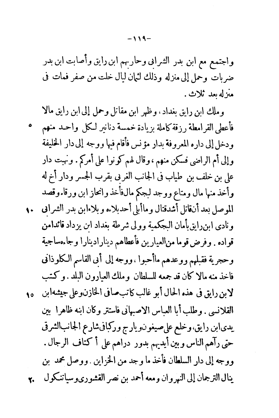 وملك ابن رايق بغداد، وظهر ابن مقاتل وحمل إلى ابن رايق مالاً فأعطى القرامطة رزقة كاملة بزيادة خمسة دنانير لكل واحد منهم ودخل إلى داره المعروفة بدار مؤنس فأقام فيها وجه إلى دار الخليفة وإلى أم الراضي فسكن منهم، وقال لهم كونوا على أمركم. ونهبت دار علي بن خلف بن طياب في الجانب الغربي بقرب الجسر ودار أخ له وأخذ منها مال ومتاع ووجد لبجكم مال فأخذ وانحاز ابن ورقاء وقصد الموصل بعد أن قاتل أشد قتال وما أبلى أحد بلاءه وبلاء ابن بدر الشرابي ونادى ابن رايق بأمان البجكمية وولي شرطة بغداد ابن يزداد قائداً من قواده. وفرض قوماً من العيارين فأعطاهم ديناراً ديناراً وجاءه ساجية وحجرية فقبلهم ووعدهم ما أحبوا، ووجه إلى أبي القاسم الكلوذاني فأخذ مه مالاً كان قد جمعه للسلطان وملك العيارون البلد. وكتب لابن رايق في هذه الحال أبو غالب كاتب صافي الخازن وعلى جيشه ابن القلانسي. وطلب أبا العباس الأصبهاني فاستتر وكان ابنه ظاهراً بين يدي ابن رايق، وخلع على صيغون ويارج وركبا في شارع الجانب الشرقي حتى رآهم الناس وبين أيديهم بدور دارهم على أكتاف الرجال. ووجه إلى دار السلطان فأخذ ما وحد من الخزاين. ووصل محمد بن ينال الترجمان إلى النهروان ومعه أحمد بن نصر القشوري وسياتنكول