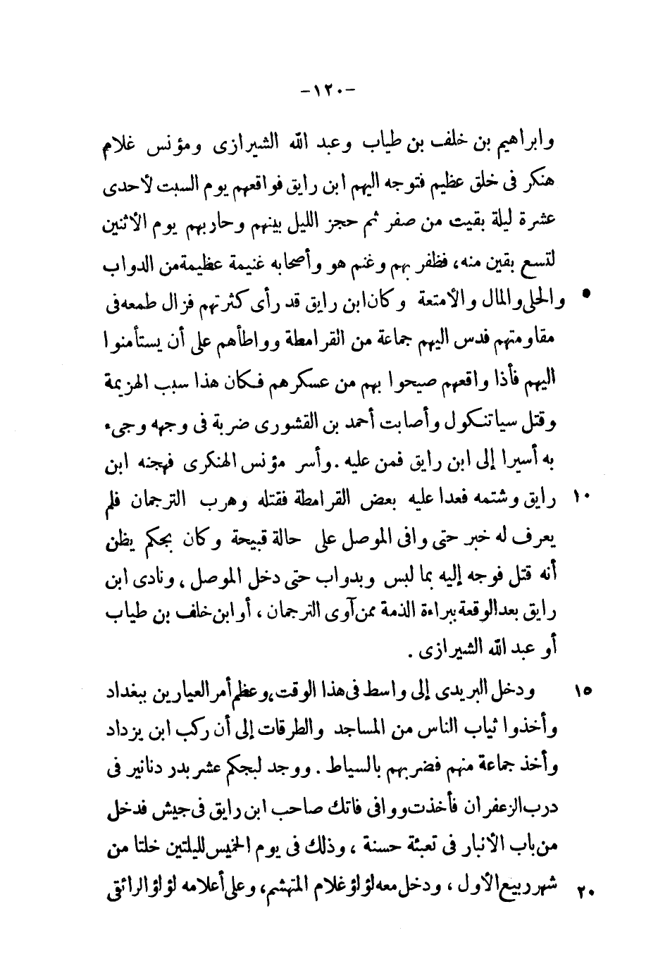وإبراهيم بن خلف بن طياب وعبد الله الشيرازي ومؤنس غلام هنكر في خلق عظيم فتوجه إليهم ابن رايق فواقعهم يوم السبت لإحدى عشرة ليلة بقيت من صفر ثم حجز الليل بينهم وحاربهم يوم الاثنين لتسع بقين منه، فظفر بهم وغنم هو وأصحابه غنيمة عظيمة من الدواب والحلي والمال والأمتعة وكان ابن رايق قد رأى كثرتهم فزال طمعه في مقاومتهم فدس إليهم جماعة من القرامطة وواطأهم على أن يستأمنوا إليهم فإذا واقعهم صيحوا بهم من عسكرهم فكان هذا سبب الهزيمة وقتل سياتنكول وأصابت أحمد بن القشوري ضربة في وجهه وجيء به أسيراً إلى ابن رايق فمن عيه. وأسر مؤنس الهنكري فهجنه ابن رايق وشتمه فعدا عليه بعض القرامطة فقتله وهرب الترجمان فلم يعرف له خبر حتى وافى الموصل على حالة قبيحة وكان بجكم يظن أنه قتل فوجه إليه بما لبس وبدواب حتى دخل الموصل، ونادى ابن رايق بعد الوقعة ببراءة الذمة ممن آوى الترجمان، أو ابن خلف بن طياب أو عبد الله الشيرازي.