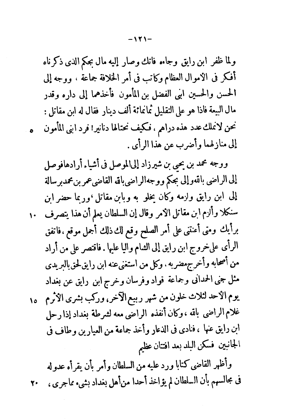 ولما ظفر ابن رايق وجاءه فاتك وصار إليه مال بجكم الذي ذكرناه أفكر في الأموال العظام وكاتب في أمر الخلافة جماعة، ووجه إلى الحسن والحسين ابني الفضل بن المأمون فأخذهما إلى داره وقدر مال البيعة فإذا هو على التقليل ثمانمائة ألف دينار فقال له ابن مقاتل: نحن لا نملك عدد هذه دراهم، فكيف نحتالها دنانير فرد ابني المأمون منازلهما وأضرب عن هذا الرأي.