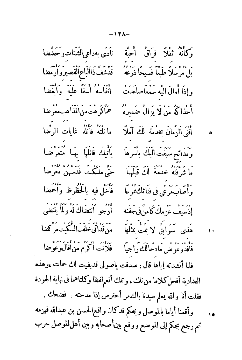 فلما أنشدته إياها قال: صدقت يا صولي قد بقيت لك حمات، وهذه الضادية أفحل كلاماً من تلك، وتلك أنعم لفظاً وكلتاهما في نهاية الجودة فقلت أنا والله يعلم سيدنا بالشعر أحترس إذا مدحته، فضحك.