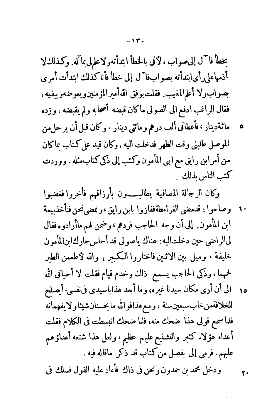 بخطأ فآل إلى صواب، لأني بالخطأ ابتدأته ولا علم لي بمآله. وكذلك لا أذمها على رأي ابتدأته بصواب فآل إلى خطأ فأنا كذلك ابتدأت أمري بصواب ولا أعلم المغيب. فقلت يوفق الله أمير المؤمنين ويعوضه ويبقيه، فقال الراغب أدفع إلى الصولي ما كان قبضه أصحابه ولم يقبضه، وزده مائة دينار، فأعطاني ألف درهم ومائتي دينار. وكان قبل أن يرحل من الموصل طلبني وقت الظهر فدخلت إليه، وكان قيد على كتاب بما كان من أمر ابن رايق مع ابني المأمون وكتب إلى ذكي كتاب مثله. ووردت كتب الناس بذلك.