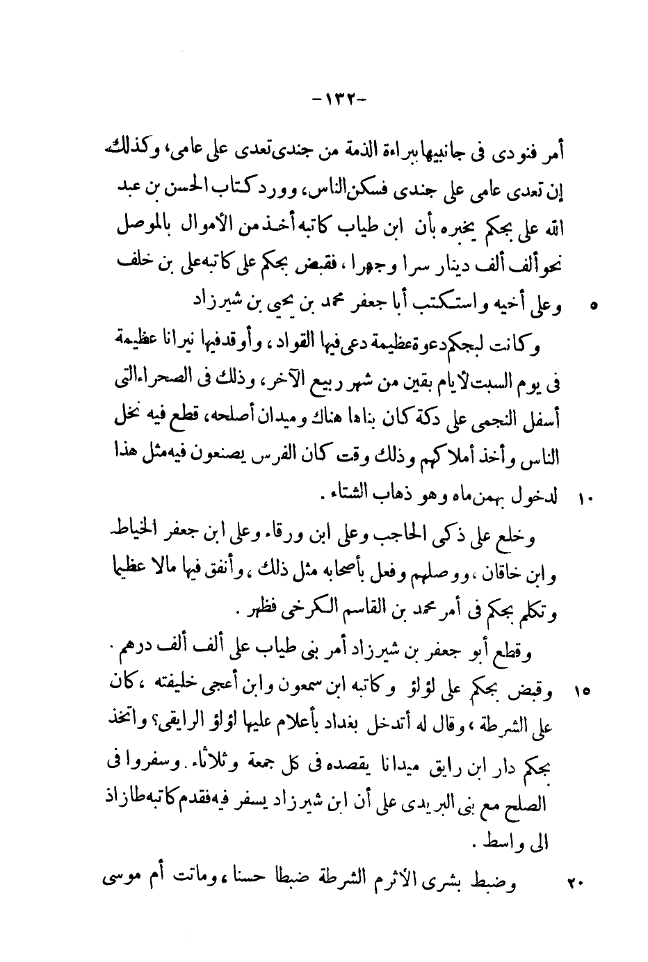 أمر فنودي في جانبيها ببراءة الذمة من جندي تعدى على عامي، وكذلك إن تعدى عامي على جندي فسكن الناس، وورد كتاب الحسن بن عبد الله على بجكم يخبره بأن ابن طياب كاتبه أخذ من الأموال بالموصل نحو ألف ألف دينار سراً وجهراً، فقبض بجكم على كاتبه علي بن خلف وعلى أخيه واستكتب أبا جعفر محمد بن يحيى بن شيرزاد.