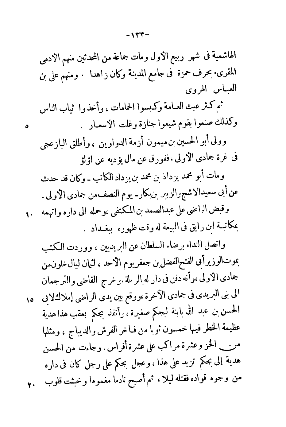 الهاشمية في شهر ربيع الأول ومات جماعة من المحدثين منهم الأدمي المقرئ بحرف حمزة في جامع المدينة وكان زاهداً. ومنهم علي بن العباس الهروي.