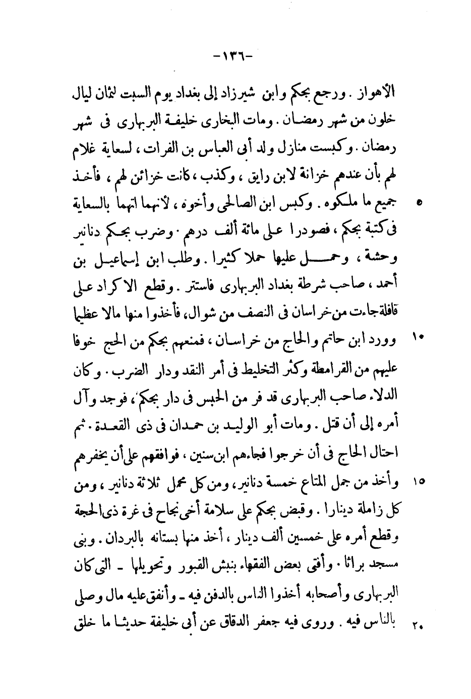 الأهواز. ورجع بجكم وابن شيرزاد إلى بغداد يوم السبت لثمان ليال خلون من شهر رمضان. ومات البخاري خليفة البربهاري في شهر رمضان. وكبست منازل ولد أبي العباس بن الفرات، لسعاية غلام لهم بأن عندهم خزانة لابن رايق، وكذب، كانت خزائن لهم، فأخذ جميع ما ملكوه. وكبس ابن الصالحي وأخوه، لنهما اتهما بالسعاية في كتبة بجكم، فصودرا على مائة ألف درهم. وضرب بجكم دنانير وحشة، وحمل عليها حملاً كثيراً. وطلب ابن إسماعيل بن أحمد، صاحب شرطة بغداد البربهاري فاستتر. وقطع الأكراد على قافلة جاءت من خراسان في النصف من شوال، فأخذوا منها مالاً عظيماً وورد ابن حاتم والحاج من خراسان، فمنعهم بجكم من الحج خوفاً عليهم من القرامطة وكثر التخليط في أمر النقد ودار الضرب. وكان الدلاء صاحب البربهاري قد فر من الحبس في دار بجكم، فوجد وآل أمره إلى أن قتل. ومات أبو الوليد بن حمدان في ذي القعدة. ثم احتال الحاج في أن خرجوا فجاءهم ابن سنين، فوافقهم على أن يخفره وأخذ من جمل المتاع خمسة دنانير، ومن كل محمل ثلاثة دنانير، ومن كل زاملة دينارً. وقبض بجكم على سلامة أخي نجاح في غرة ذي الحجة وقطع أمره على خمسين ألف دينار، أخذ منها بستانه بالبردان. وبنى مسجد براثا. وأفتى بعض الفقهاء بنبش القبور وتحويلها - التي كان البربهاري وأصحابه أخذوا الناس بالدفن فيه - وأنفق عليه مال وصلى الناس فيه. وروى في جعفر الدقاق عن أبي خليفة حديثاً ما خلق