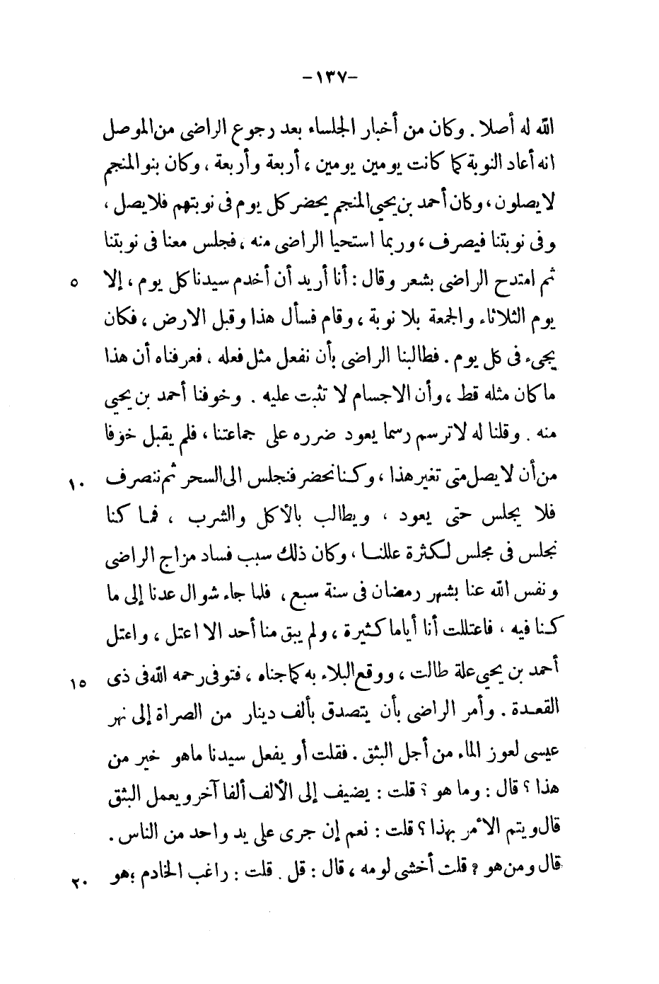 الله له أصلاً. وكان من أخبار الجلساء بعد رجوع الراضي من الموصل أنه أعاد النوبة كما كانت يومين يومين، أربعة وأربعة، وكان بنو المنجم لا يصلون، وكان أحمد بن يحيى المنجم يحضر كل يوم في نوبته فلا يصل، وفي نوبتنا فيصرف، وربما استحيا الراضي منه، فجلس معنا في نوبتنا ثم امتدح الراضي بشعر وقال: أنا أريد أن أخدم سيدنا كل يوم، إلا يم الثلاثاء والجمعة بلا نوبة، وقام فسأل هذا وقبل الأرض فكان يجيء في كل. فطالبنا الراضي بأن نفعل مثل فعله، فعرفناه أن هذا ما كان مثله قط، وأن الأجسام لا تثبت عليه. وخوفنا أحمد