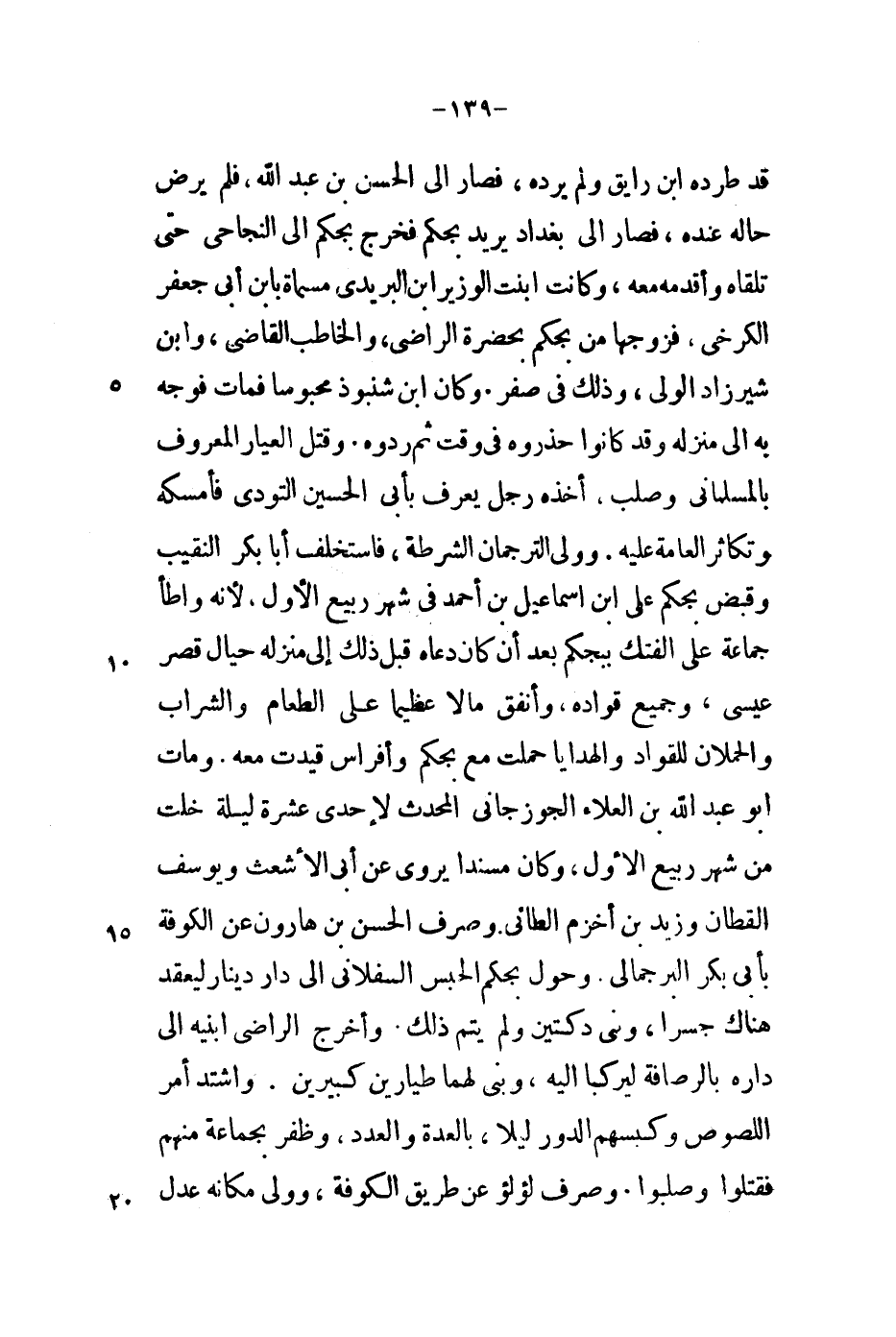 قد طرده ابن رايق ولم يرده، فصار إلى الحسن بن عبد الله، فلم يرض حاله عنده، فصار إلى بغداد يريد بجكم فخرج بجكم إلى النجاحي حتى تلقاه وأقدمه معه، وكانت ابنت الوزير ابن البريدي مسماة بابن أبي جعفر الكرخي، فزوجها من بجكم بحضرة الراضي، والخاطب القاضي، وابن شيرزاد الولي، وذلك في صفر. وكان ابن شنبوذ محبوساً فمات فوجه به إلى منزله وقد كانوا حذروه في وقت ثم ردوه. وقتل العيار المعروف بالمسلماني وصلب، أخذه رجل يعرف بأبي الحسين التودي فأمسكه وتكاثر العامة عليه. وولي الترجمان الشرطة، فاستخلف أبا بكر النقيب وقبض بجكم على ابن إسماعيل بن أحمد في شهر ربيع الأول. لأنه واطأ جماعة على الفتك ببجكم بعد أن كان دعاه قبل ذلك إلى منزله حيال قصر عيسى، وجميع قواده، وأنفق مالاً عظيماً على الطعام والشراب والحملان للقواد والهدايا حملت مع بجكم وأفراس قيدت معه. ومات أبو عبد الله بن العلاء الجوزجاني المحدث لإحدى عشرة ليلة خلت من شهر ربيع الأول، وكان مسنداً يروى عن أبي الأشعث ويوسف القطان وزيد بن أخزم الطائي. وصرف الحسن بن هارون عن الكوفة بأبي بكر البرجمالي. وحول بجكم الحبس السفلاني إلى دار دينار ليعقد هناك جسراً، وبنى دكتين ولم يتم ذلك. وأخرج الراضي ابنيه إلى داره بالرصافة ليركبا إليه، وبنى لهما طيارين كبيرين. واشتد أمر اللصوص وكبسهم الدور ليلاً، بالعدة والعدد، وظفر بجماعة منهم فقتلوا وصلبوا. وصرف لؤلؤ عن طريق الكوفة، وولي مكانه عدل