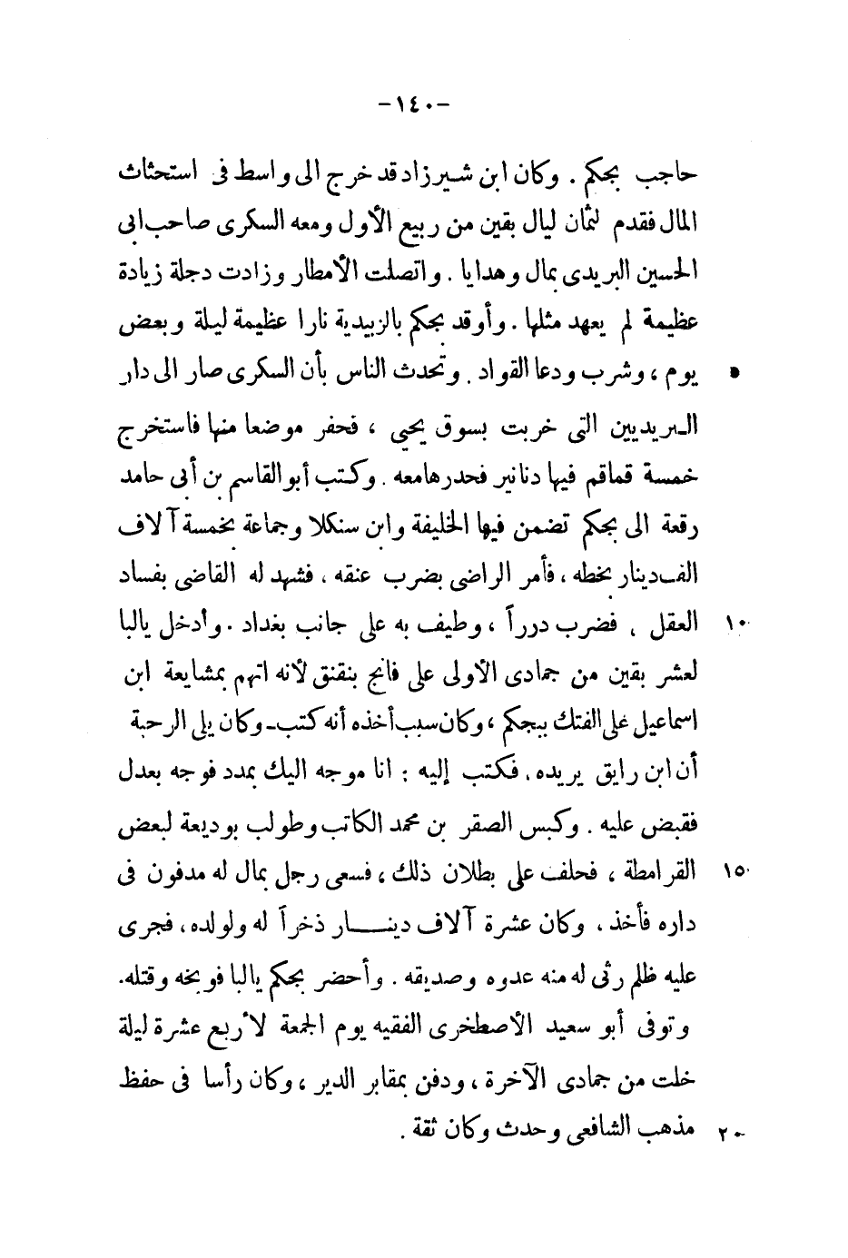 حاجب بجكم. وكان ابن شيرزاد قد خرج إلى واسط في استحثاث المال فقدم لثمان ليال بقين من ربيع الأول ومعه السكري صاحب أبي الحسين البريدي بمال وهدايا. واتصلت الأمطار وزادت دجلة زيادة عظيمة لم يعهد مثلها. وأوقد بجكم بالزبيدية ناراً عظيمة ليلة وبعض يوم، وشرب ودعا القواد. وتحدث الناس بأن السكري صار إلى دار البريديين التي خربت بسوق يحيى، فحفر موضعاً منها فاستخرج خمسة قماقم فيها دنانير فحدرها معه. وكتب أبو القاسم بن أبي حامد رقعة إلى بجكم تضمن فيها الخليفة وابن سنكلا وجماعة بخمسة آلاف ألف دينار بخطه، فأمر الراضي بضرب عنقه، فشهد له القاضي بفساد العقل، فضرب درراً، وطيف به على جانب بغداد. وأدخل يالبا لعشر بقين من جمادى الأولى على فانج بنقنق لأنه اتهم بمشايعة ابن إسماعيل على الفتك ببجكم، وكان سبب أخذه أنه موجه إليك بمدد فوجه بعدل فقبض عليه. وكبس الصقر بن محمد الكاتب وطولب بوديعة لبعض القرامطة، فحلف على بطلان ذلك، فسعى رجل بمال له مدفون في داره فأخذ، وكان عشرة آلاف دينار ذخراً له ولولده، فجرى عليه ظلم رثى له منه عدوه وصديقه. وأحضر بجكم يالبا فوبخه وقتله. وتوفي أبو سعيد الاصطخري الفقيه يوم الجمعة لأربع عشرة ليلة خلت من جمادى الآخرة، ودفن بمقابل الدنر، كان رأساً في حفظ مذهب الشافعي وحدث وكان ثقة.