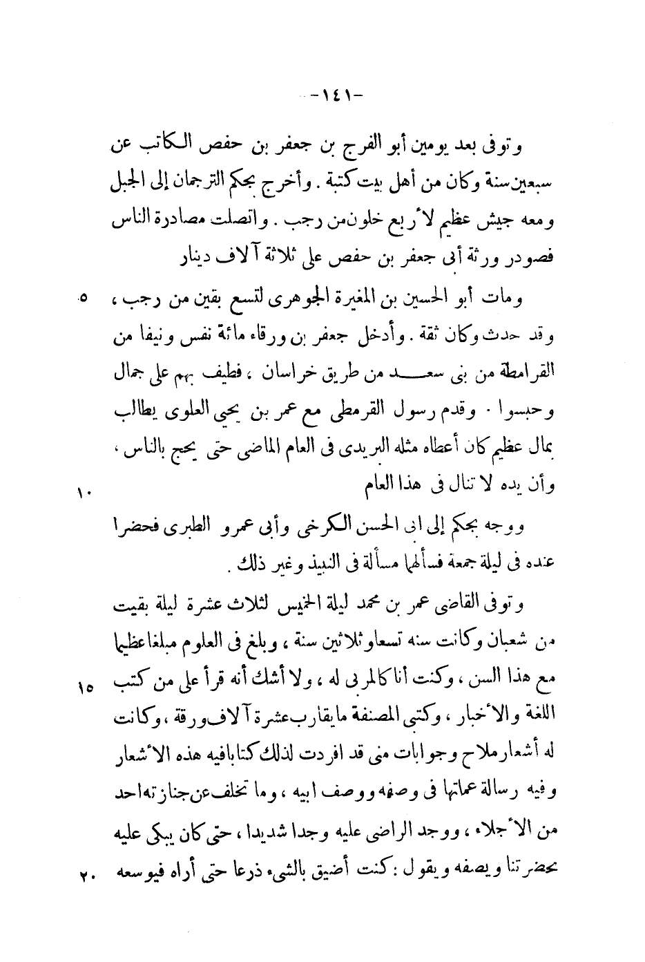 وتوفي القاضي عمر بن محمد ليلة الخمسي لثلاث عشرة ليلة بقيت من شعبان وكانت سنة تسعاً وثلاثين سنة، وبلغ في العلوم مبلغاً عظيماً مع هذا السن، وكنت أنا كالمربي له، ولا أشك أنه قرأ علي من كتب اللغة والأخبار، وكتبي المصنفة ما يقارب عشرة آلاف ورقة، وكانت له أشعار ملاح وجوابات مني قد أفردت لذلك كتاباً فيه هذه الأشعار وفيه رسالة عملتها في وصفه ووصف أبيه، ومات تخلف عن جنازته أحد من الأجلاء، ووجد الراضي عليه وجداً شديداً، حتى كان يبكي عليه بحضرتنا ويصفه ويقول: كنت أضيق بالشيء ذرعاً حتى أراه فيوسعه