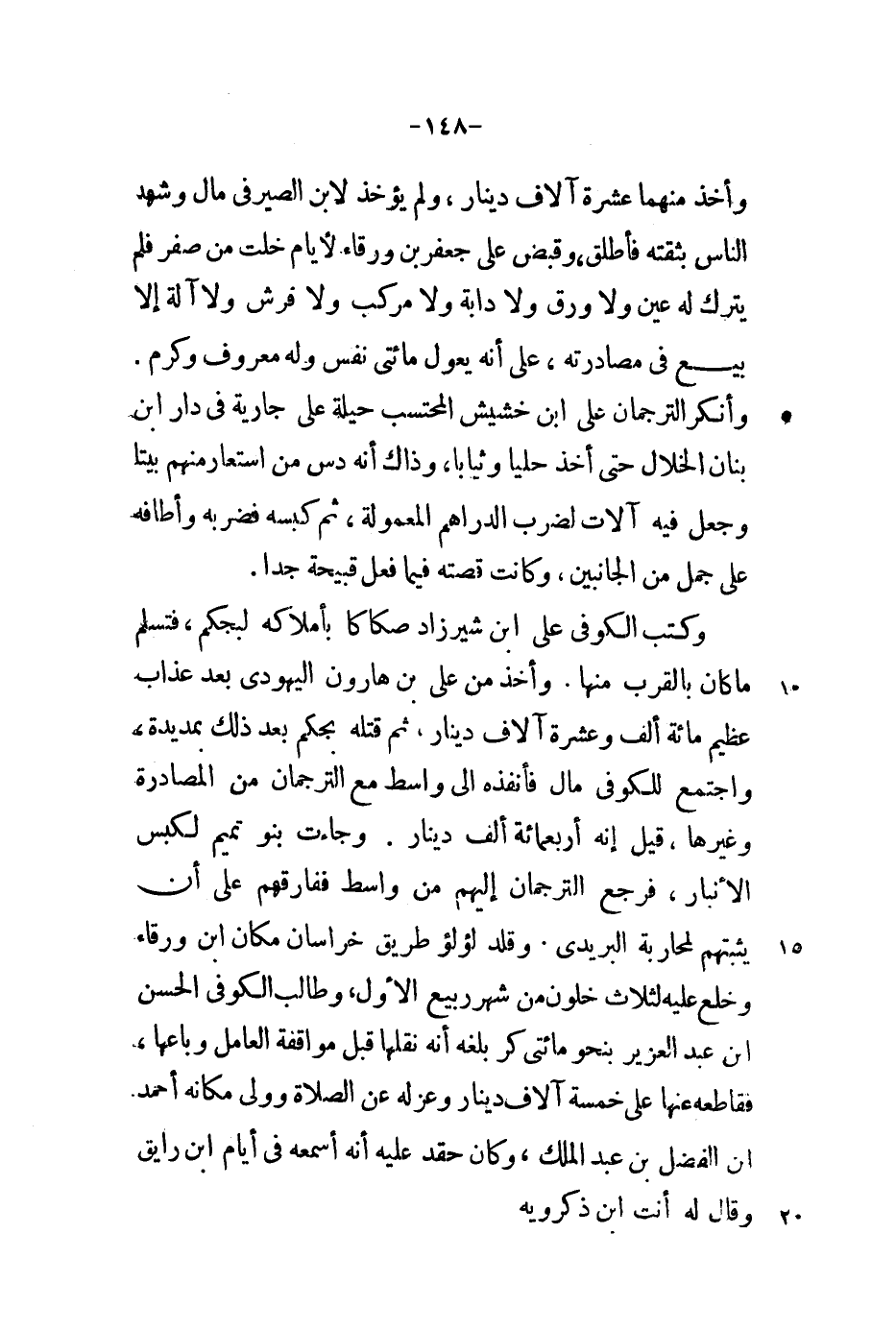 وأخذ منهما عشرة آلاف دينار، ولم يؤخذ لابن الصيرفي مال وشهد الناس بثقته فأطلق، وقبض على جعفر بن ورقاء لأيام خلت من صفر فلم يترك له عين ولا ورق ولا دابة ولا مركب ولا فرش ولا آلة إلا بيع في مصادرته، على أنه يعول مائتي نفس وله معروف وكرم. وأنكر الترجمان على ابن خشيش المحتسب حيلة على جارية في دار ابن بنان الخلال حتى اخذ حلياً وثياباً، وذاك أنه دس من استعار منهم بيتاً وجعل فيه آلات لضرب الدراهم المعمولة، ثم كبسه فضربه وأطافه على جمل من الجانبين، وكانت قصته فيما فعل قبيحة جداً.
