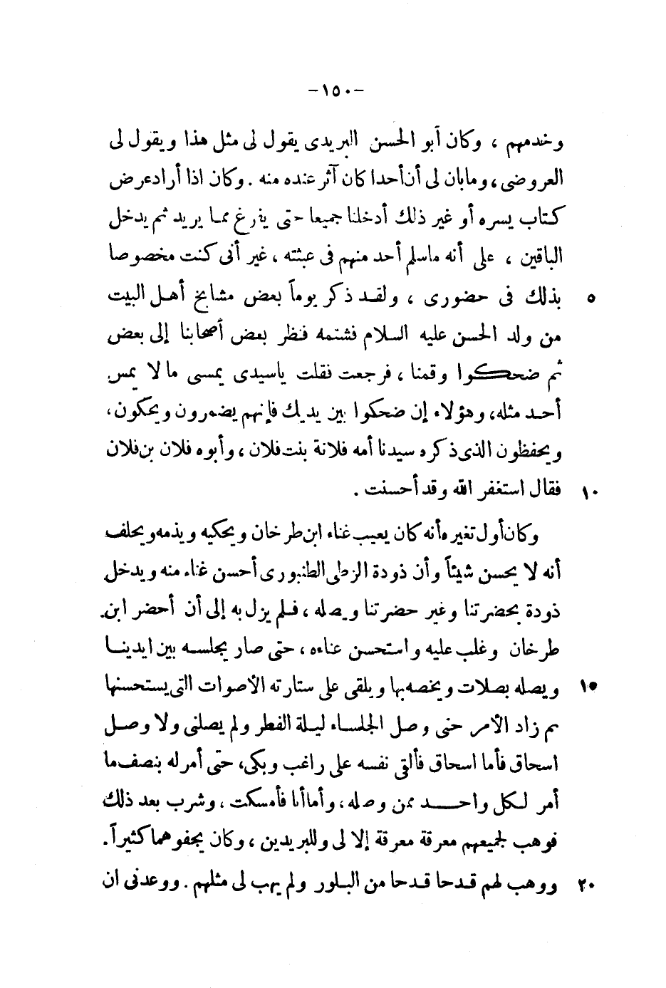 وخدمهم، وكان أبو الحسن البريدي يقول لي مثل هذا ويقول العروضي، ما بان لي أن أحداً كان آثر عنده مه. وكان إذا أراد عرض كتاب يسره أو غير ذلك أدخلنا جميعاً حتى يفرغ مما يريد ثم يدخل الباقين، على أنه ما سلم أحد منهم في عبثته، غير أني كنت مخصوصاً بذلك في حضوري، ولقد ذكر يوماً بعض مشايخ أهل البيت من ولد الحسن عليه السلام فشتمه فنظر بعض أصحابنا إلى بعض ثم ضحكوا وقمنا، فرجعت فقلت يا سيدي يمسي مالاً يمس أحد مثله، وهؤلاء إن ضحكوا بين يديك فإنهم يضمرون ويحكون، ويحفظون الذي ذكره سيدنا أمه فلانة بنت فلان، وأبوه فلان بن فلان فقال استغفر الله وقد أحسنت.