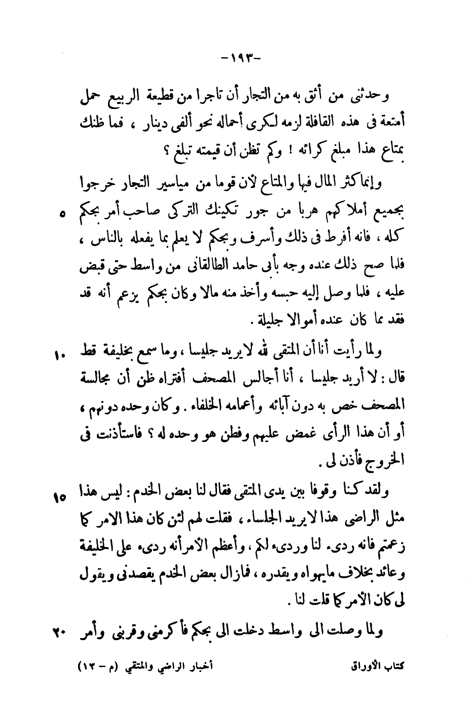 ولما رأيت أنا أن المتقي لله لا يريد جليساً، وما سمع بخليفة قد قال: لا أريد جليساً، أنا أجالس المصحف أفتراه ظن أن مجالسة المصحف خص به دون آبائه وأعمامه الخلفاء. وكان وحده دونهم، أو أن هذا الرأي غمض عليهم وفطن هو وحده له؟ فاستأذنت في الخروج فأذن لي.
