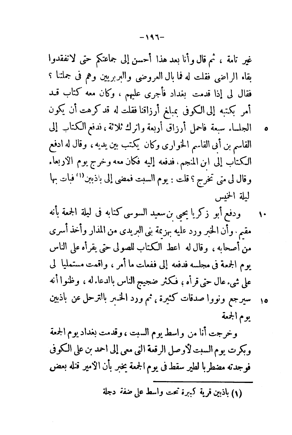غير تامة، ثم قال وأنا بعد هذا أحسن إلى جماعتكم حتى لا تفقدوا بقاء الراضي فقلت له فما بال العروضي والبربريين وهم في جملتنا؟ فقال لي إذا قدمت بغداد فأجرى عليهم، وكان معه كتاب قد أمر بكتبه إلى الكوفي بمبلغ أرزاقنا فقلت له قد كرهت أن يكون الجلساء سبعة فاحمل أرزاق أربعة واترك ثلاثة، فدفع الكتاب إلى القاسم بن أبي القاسم الخواري وكان يكتب بين يديه، وقال له ادفع الكتاب إلى ابن المنجم، فدفعه إليه فكان معه وخرج يوم الأربعاء وقال لي متى تخرج؟ قالت: يوم السبت فمضى إلى باذبين فبات بها ليلة الخميس.