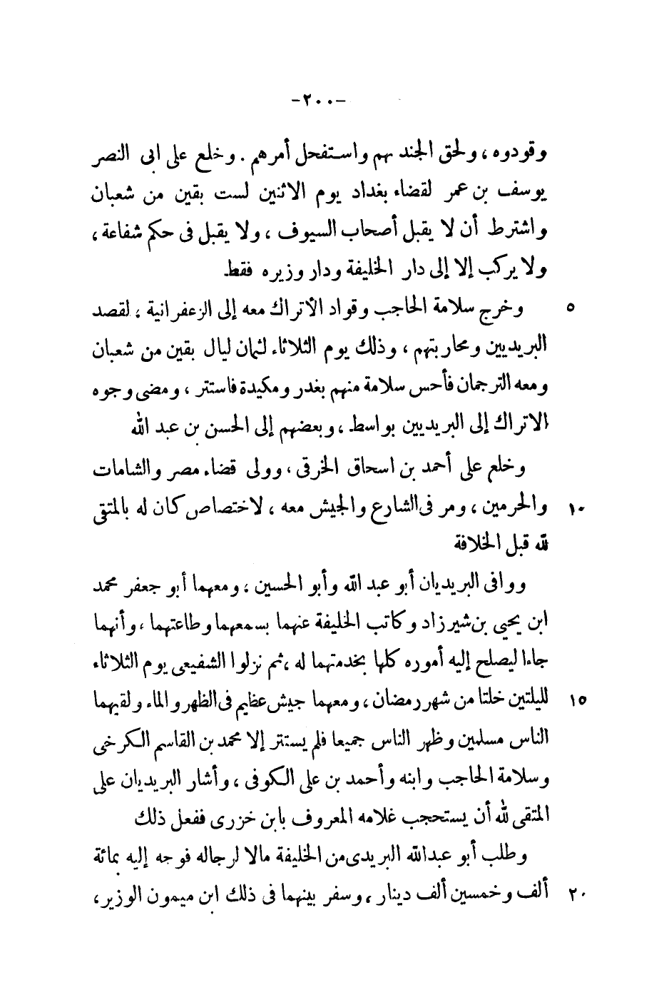 ووافى البريديان أبو عبد الله وأبو الحسين، ومعهما أبو جعفر محمد ابن يحيى بن شيرزاد وكاتب الخليفة عنهما بسمعهما وطاعتهما، وأنهما جاءا ليصلح إليه أموره كلها بخدمتهما له، ثم نزلوا الشفيعي يوم الثلاثاء لليلتين خلتا من شهر رمضان، ومعهما جيش عظيم في الظهر والماء ولقيهما الناس مسلمين وظهر الناس جميعاً فلم يستتر إلا محمد بن القاسم الكرخي وسلامة الحاجب وابنه وأحمد بن علي الكوفي، وأشار البريديان على المتقي لله أن يستحجب غلامه المعروف بابن خزري ففعل ذلك.